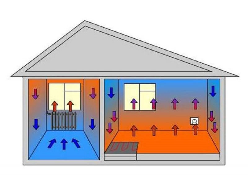При радиаторном отоплении тепловые потоки стремятся вверх, поэтому можно сказать, что они отапливают потолок. При этом, даже если в комнате тепло, а полы холодные, то человек все равно будет чувствовать, что ему холодно.