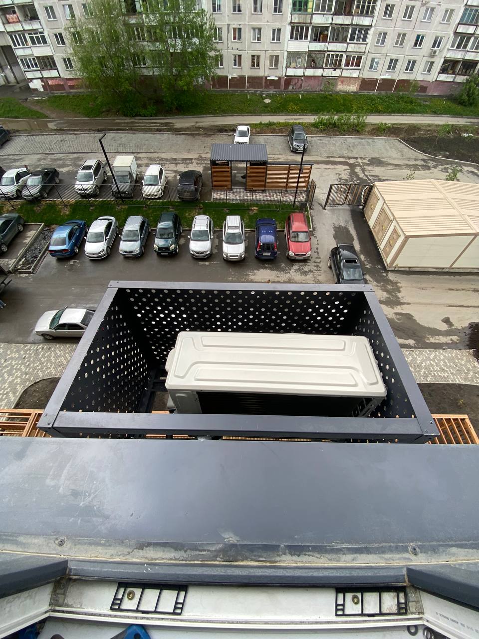 Внешний блок этого сплит-системы был предусмотрительно размещен в специально предназначенной корзине под окном.
