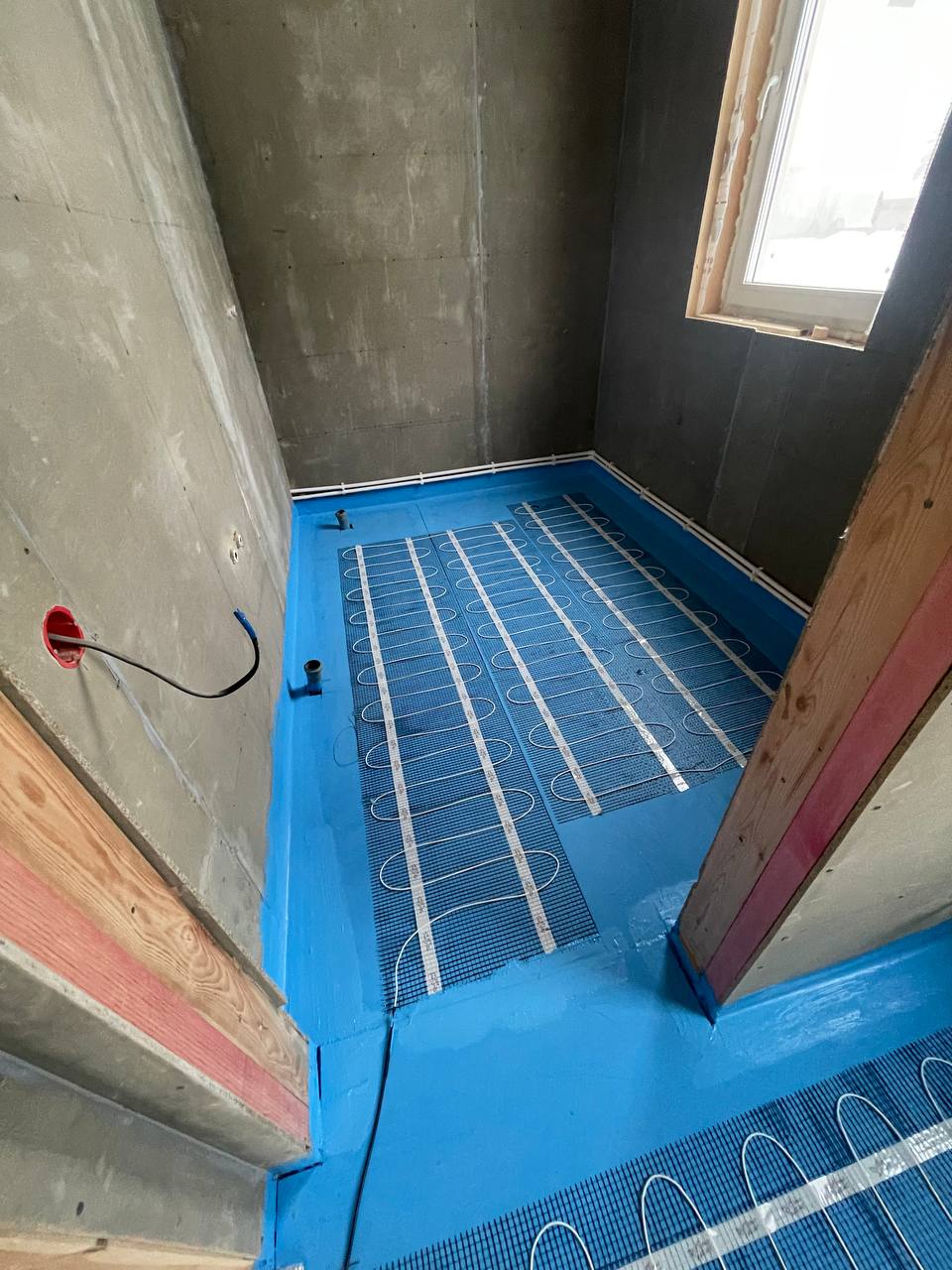 На деревянное основание укладываются листы ГВЛ либо ОСБ (желательно в два слоя). Следующим этапом все обильно проливается гидроизоляцией (яркий синий цвет).
