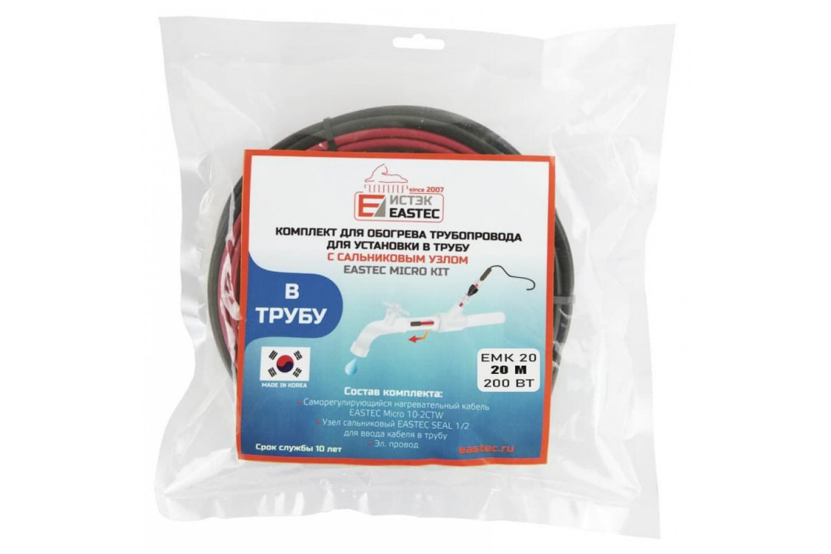 EMK-20 EASTEC комплект обогрева трубопровода для установки в трубу (20м-200 Вт) — это надежное, энергоэффективное и безопасное решение для защиты трубопроводов от замерзания. Благодаря простоте установки и долговечности, этот комплект станет отличным выбором для обеспечения бесперебойной работы водоснабжения в холодное время года.