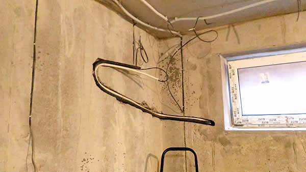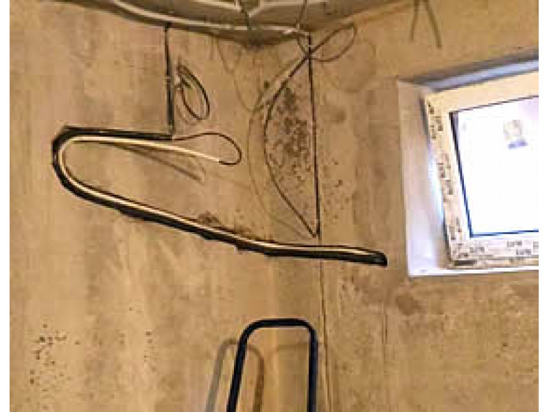 Стена в полуцокольном помещении, выполненная из качественного монолита, с трудом поддавалась штроблению. Но опыт и усердие побеждают.