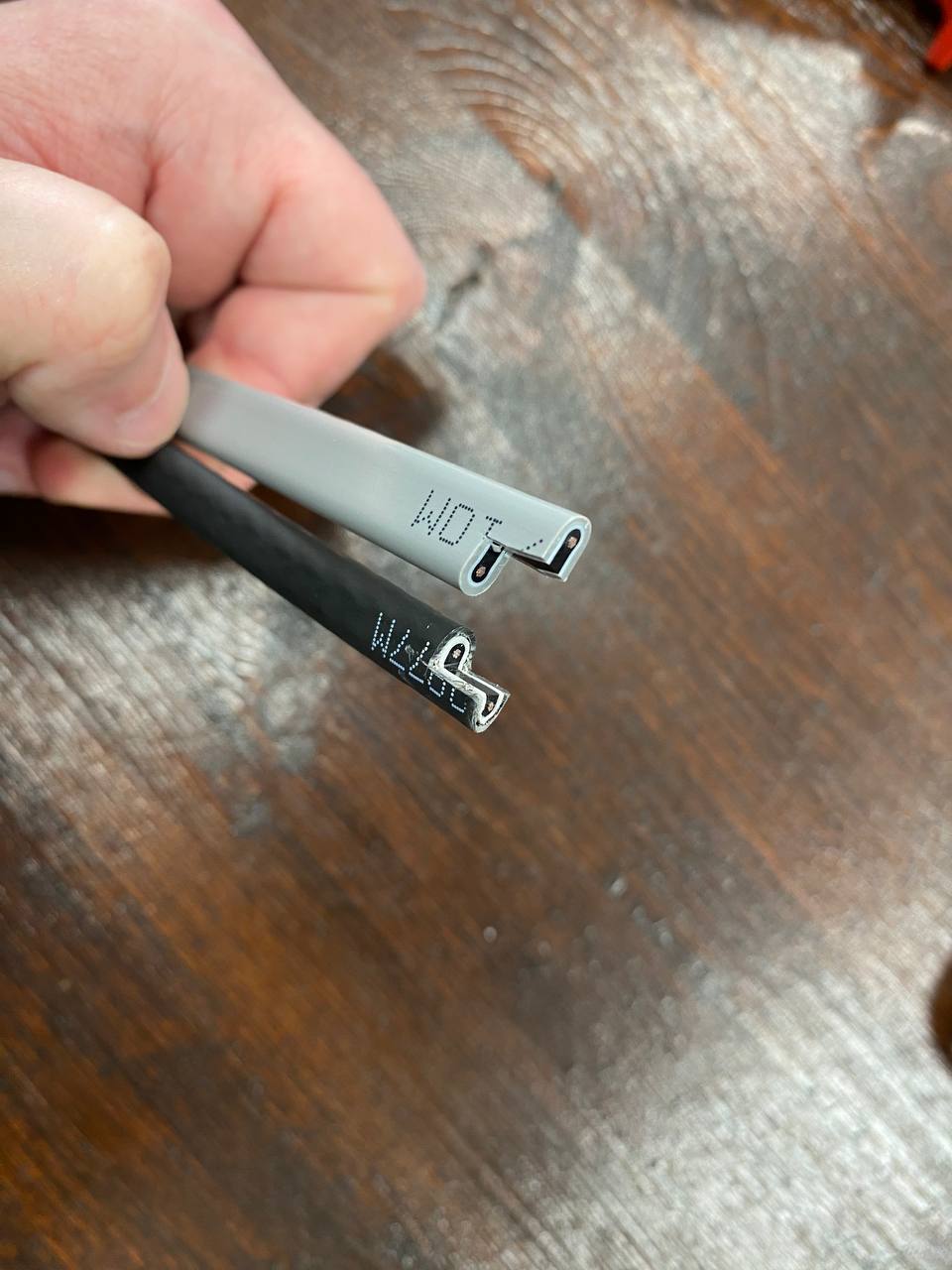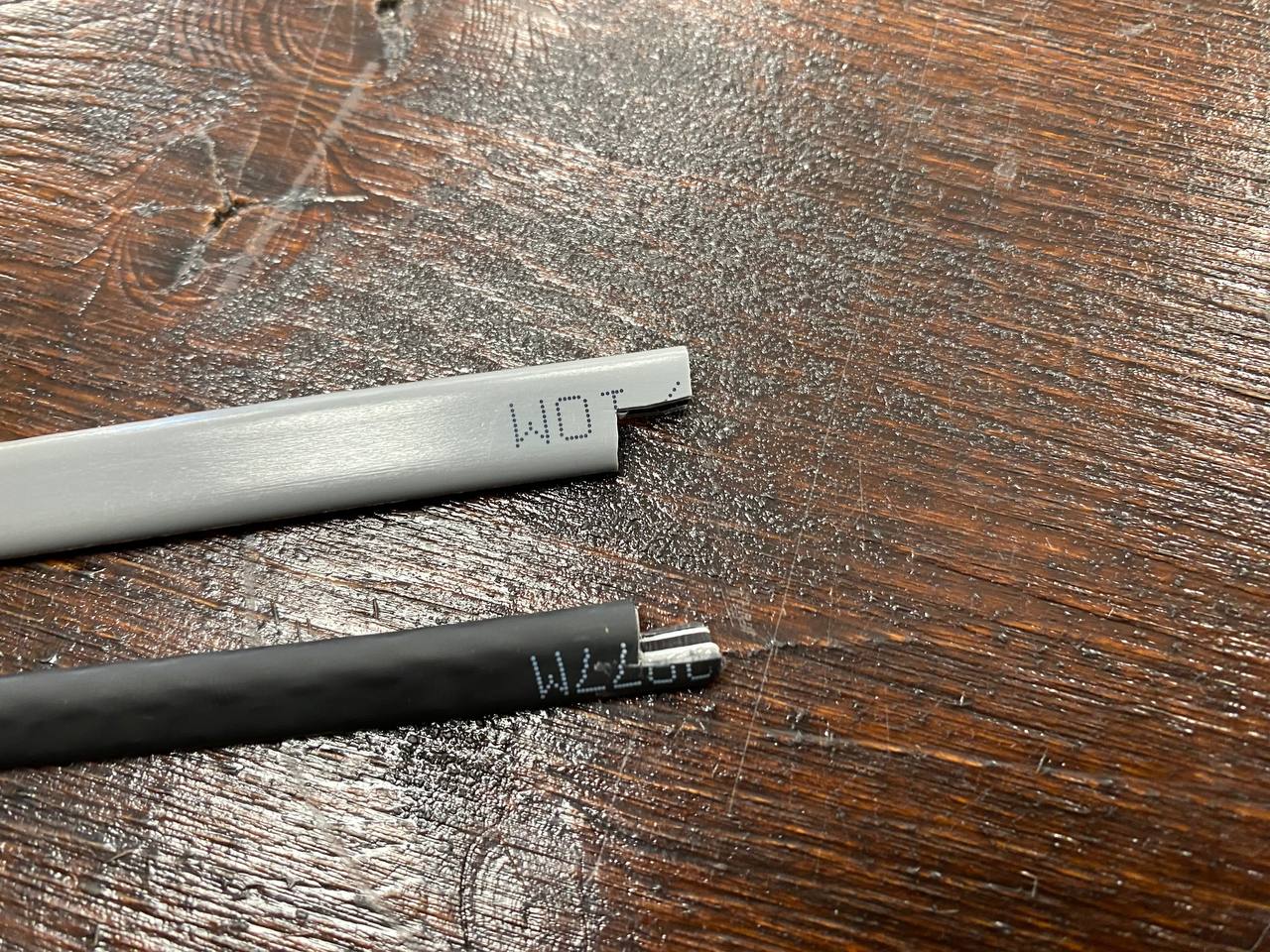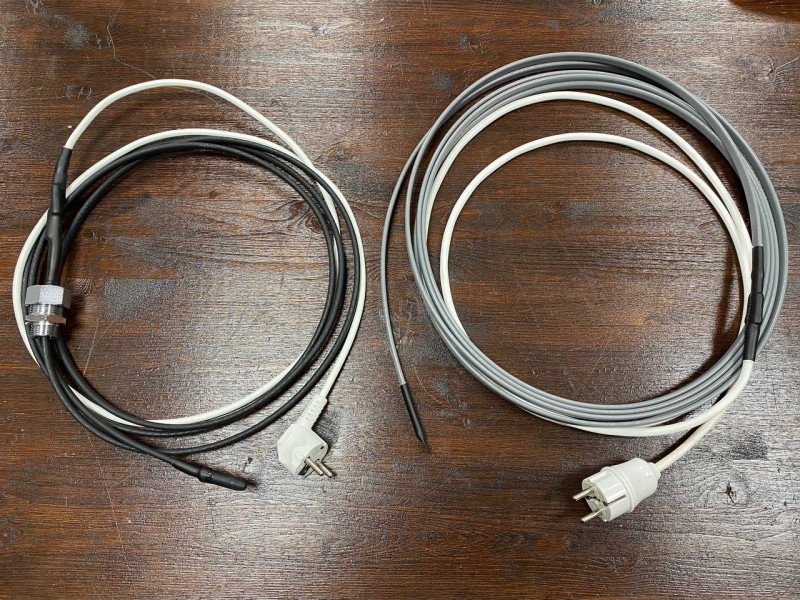 Имеем: два саморегулирующихся кабеля серого и черного цвета. Серый плоский мощностью 30Вт/м. Черный более округлый 16Вт/м. (цвет кабеля необязательно может совпадать с назначением)