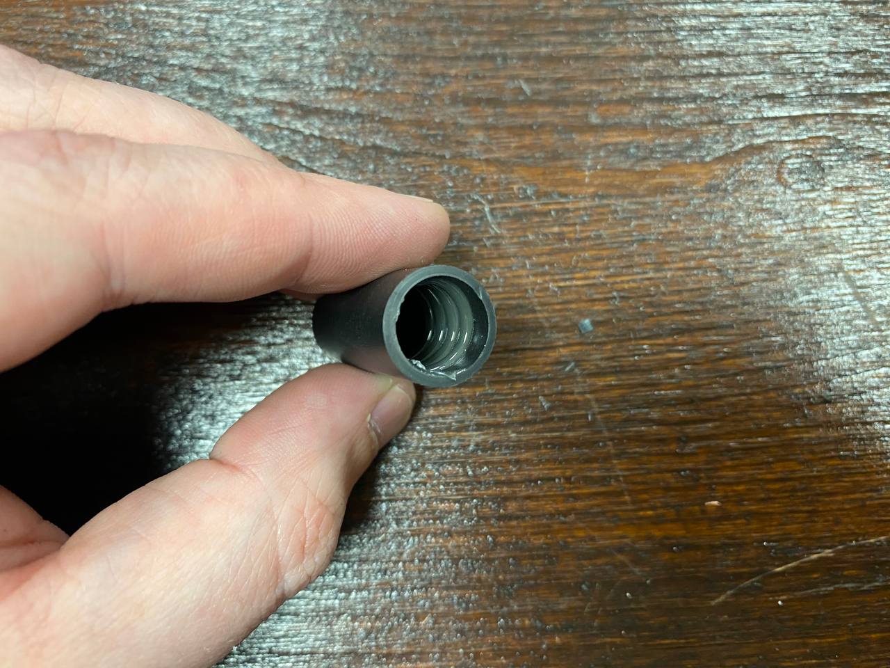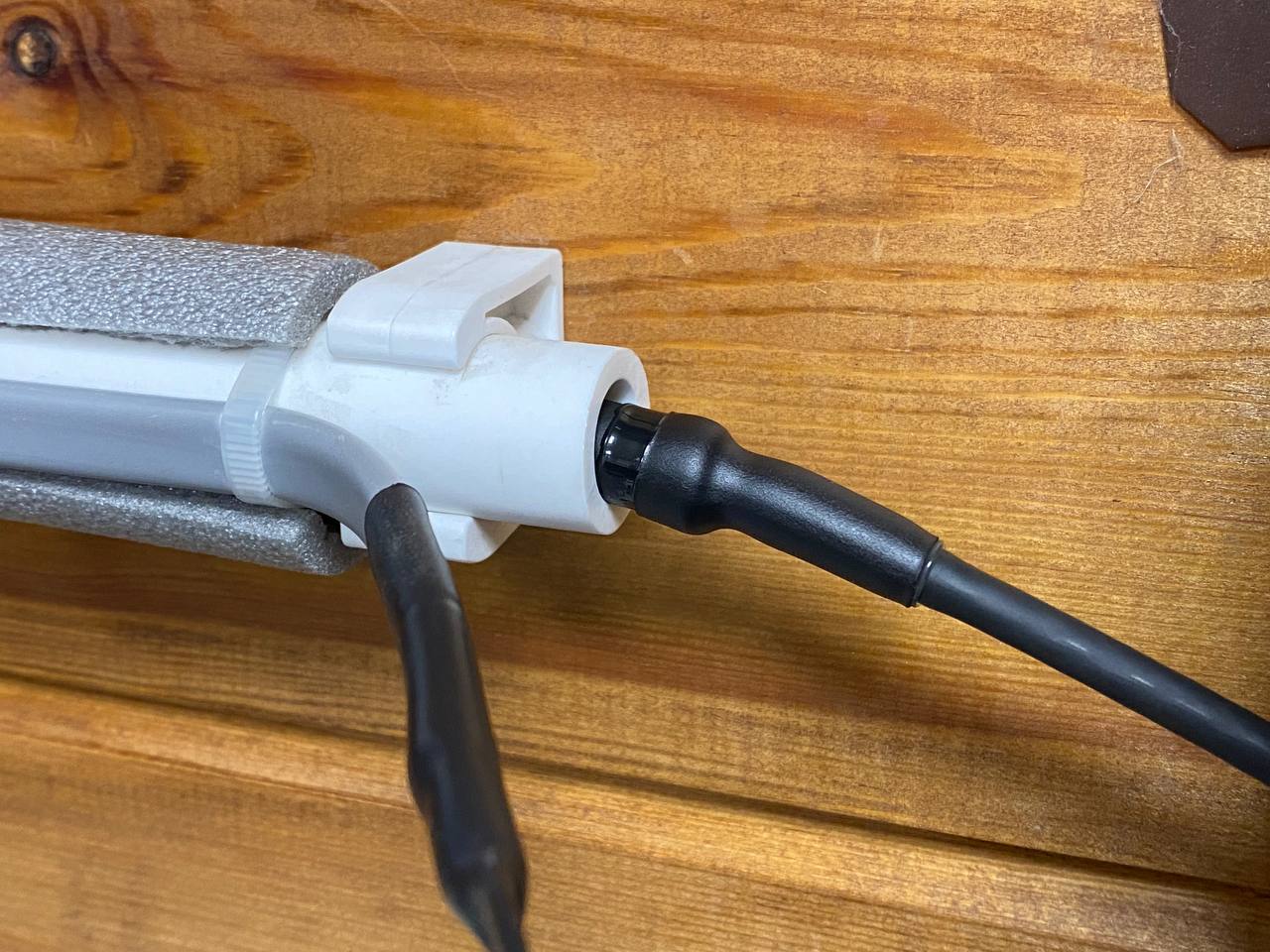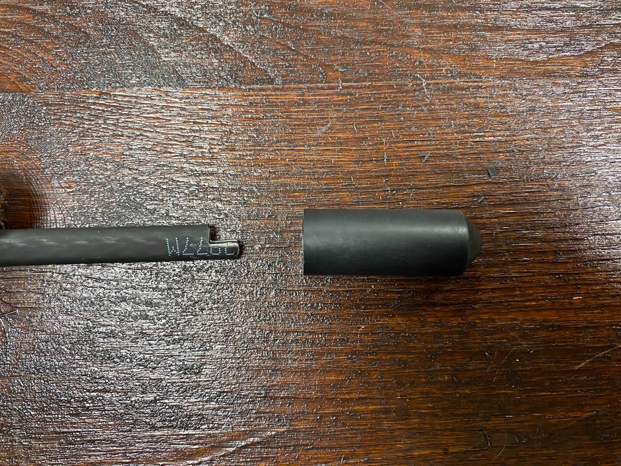 а) Серый кабель для наружного применения. Возьмем небольшой отрезок трубки термоусадки. Оденем на нагревательный элемент заранее оставив небольшой кончик. Прогреем все феном. Дадим минутку подсохнуть и обожмем свободный конец плоскогубцами. Получится так: