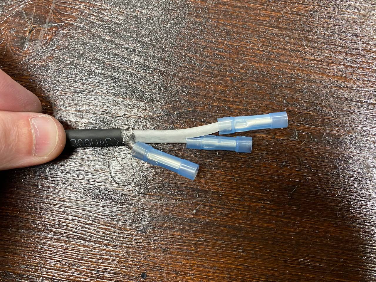- Укоротим жилы до нужной длинны под зажимную гильзу. Мы используем гильзы ГСИ(н) 2,5 изолированные в нейлоновом корпусе. Заранее наденем термоусадочную муфту, что бы не забыть =) муфты используем ТТК (3:1)-12/4 (с клеевым слоем, это обязательно!)