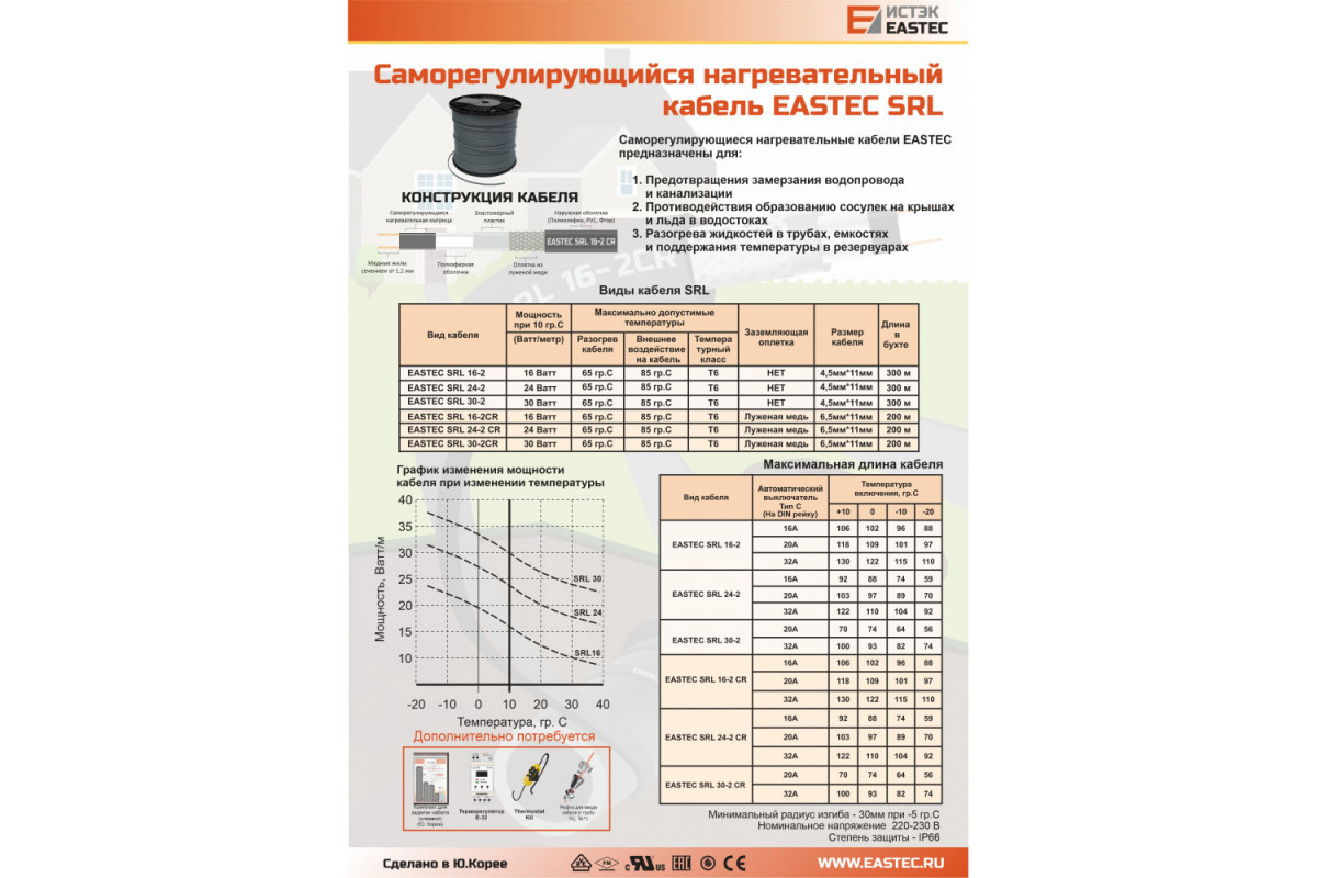 Экранированный самогреющийся кабель EASTEC SRL 24-2 CR мощностью 24 Вт применяется для защиты от перемерзания различных трубопроводов, водостоков, резервуаров и пр.