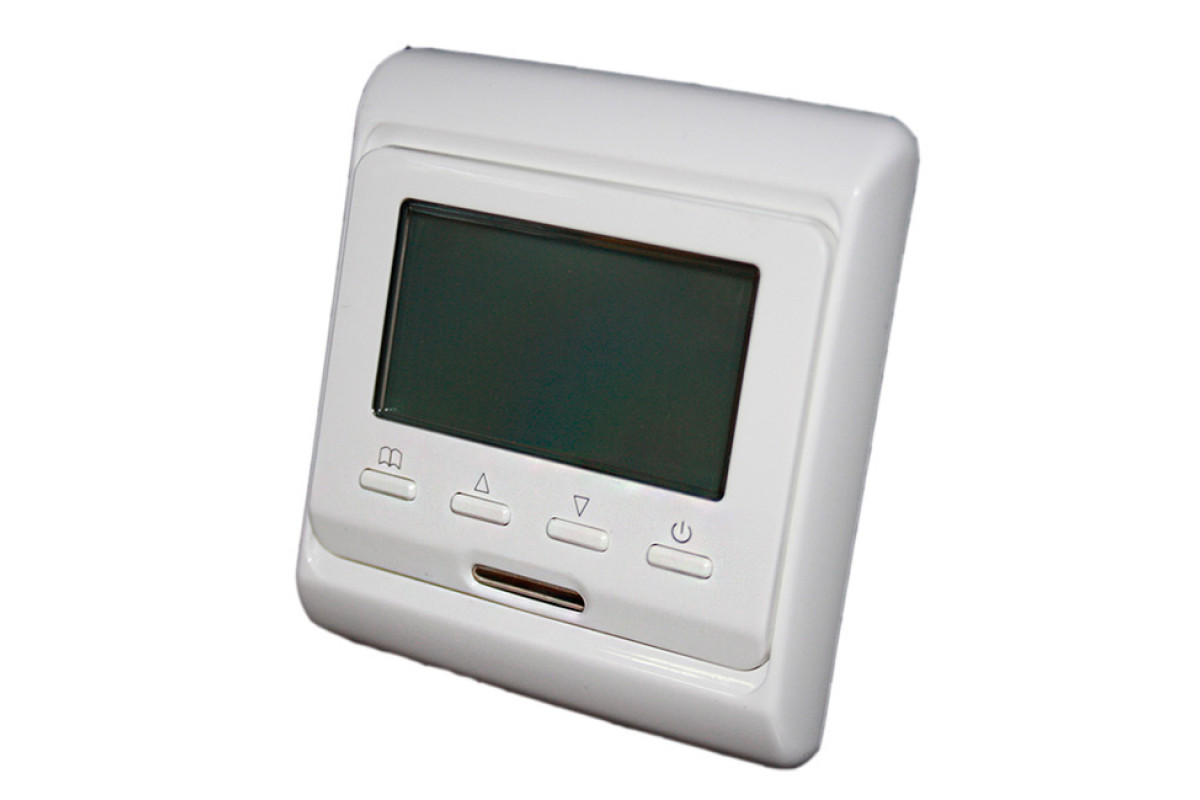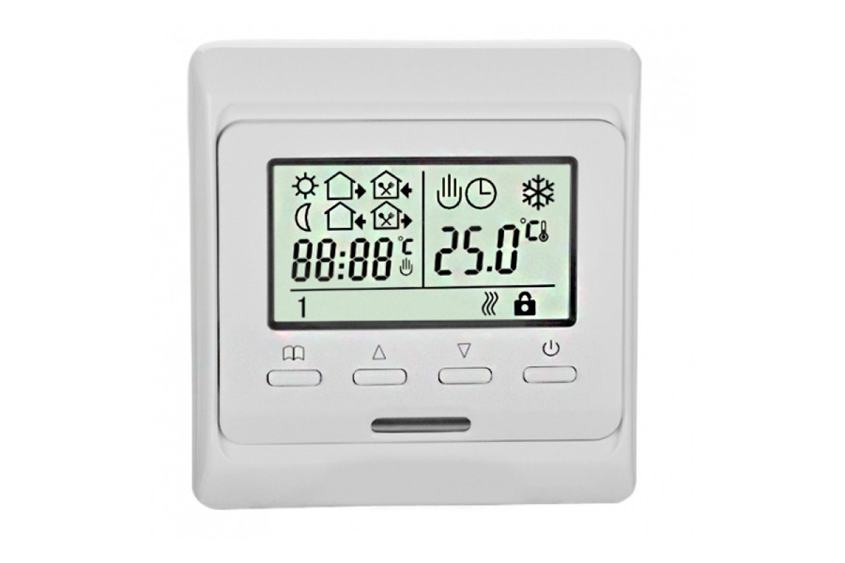 Комнатный программируемый терморегулятор с двумя датчиками температуры- выносным датчиком температуры пола и встроенным датчиком температуры воздуха. Встроенный монтаж.
