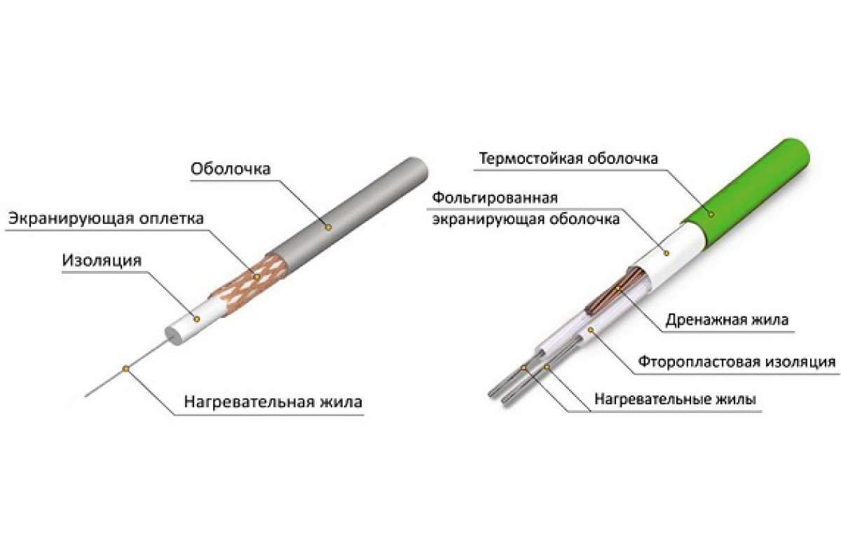 Двухжильный нагревательный кабель. В нем под общей наружной изоляцией находятся два изолированных друг от друга проводника: первый – резистивный, нагревательный, второй – «холодный» возвратный. Контакты для подключения выходят с одной стороны рабочей секции.