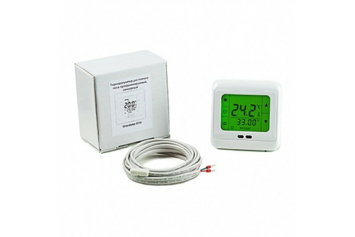Терморегулятор Grandeks G07H (сенсорный) - программируемый терморегулятор с крупным сенсорным жидкокристаллическим дисплеем и выносным датчиком температуры пола. Имеет встроенный датчик воздуха. Подходит для установки внутри помещений для любых систем электрического отопления.