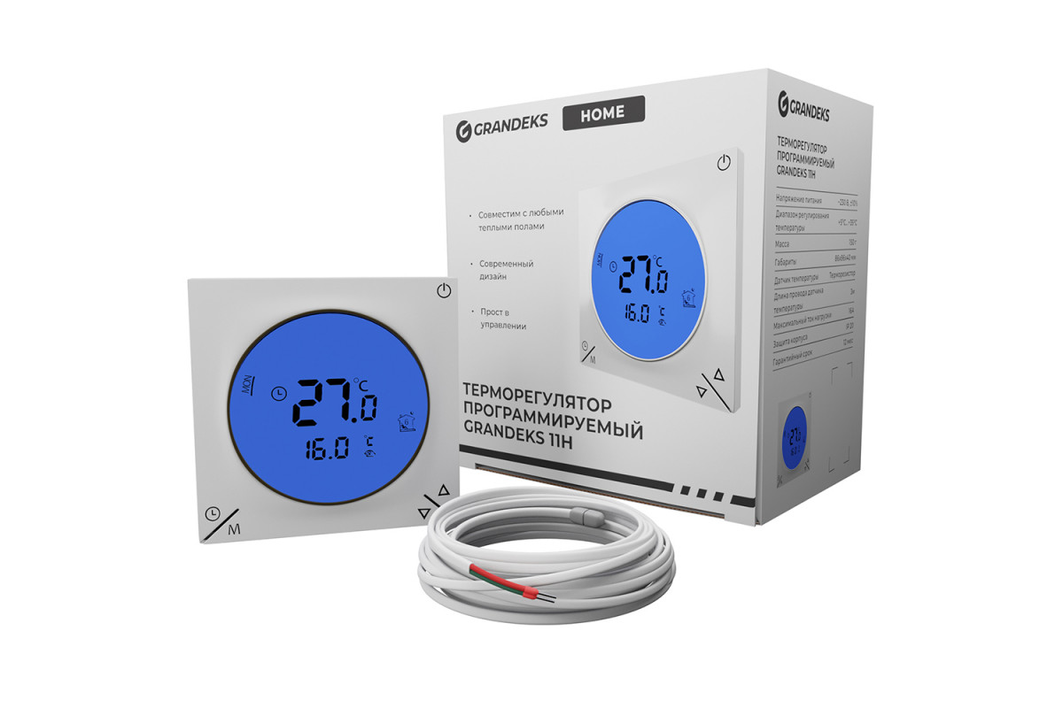 Электронный терморегулятор Grandeks (Грандекс) 11H программируемый оснащён крупным жидкокристаллическим дисплеем с выносным датчиком температуры пола, встроенным датчиком воздуха.