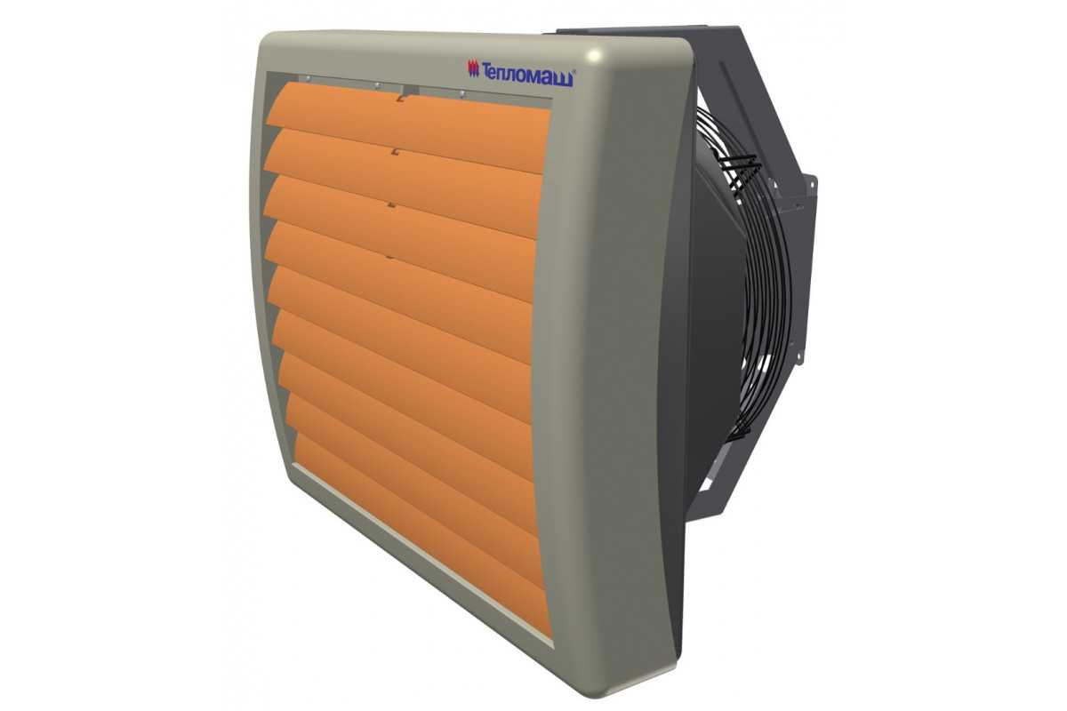 Тепловентилятор состоит из водяного воздухонагревателя, встроенного в корпус (2), пристыкованного к задней части корпуса осевого вентилятора (3) в защитной решетке и закрепленными на лицевой стороне корпуса жалюзи (6), снабженных поворотным механизмом. Корпус тепловентилятора удерживается в монтажном кронштейне (5), допускающем изменение угла установки в вертикальной плоскости в диапазоне 0-18° или фиксированные положения под углом ±30°, а также повороты в горизонтальной плоскости.
