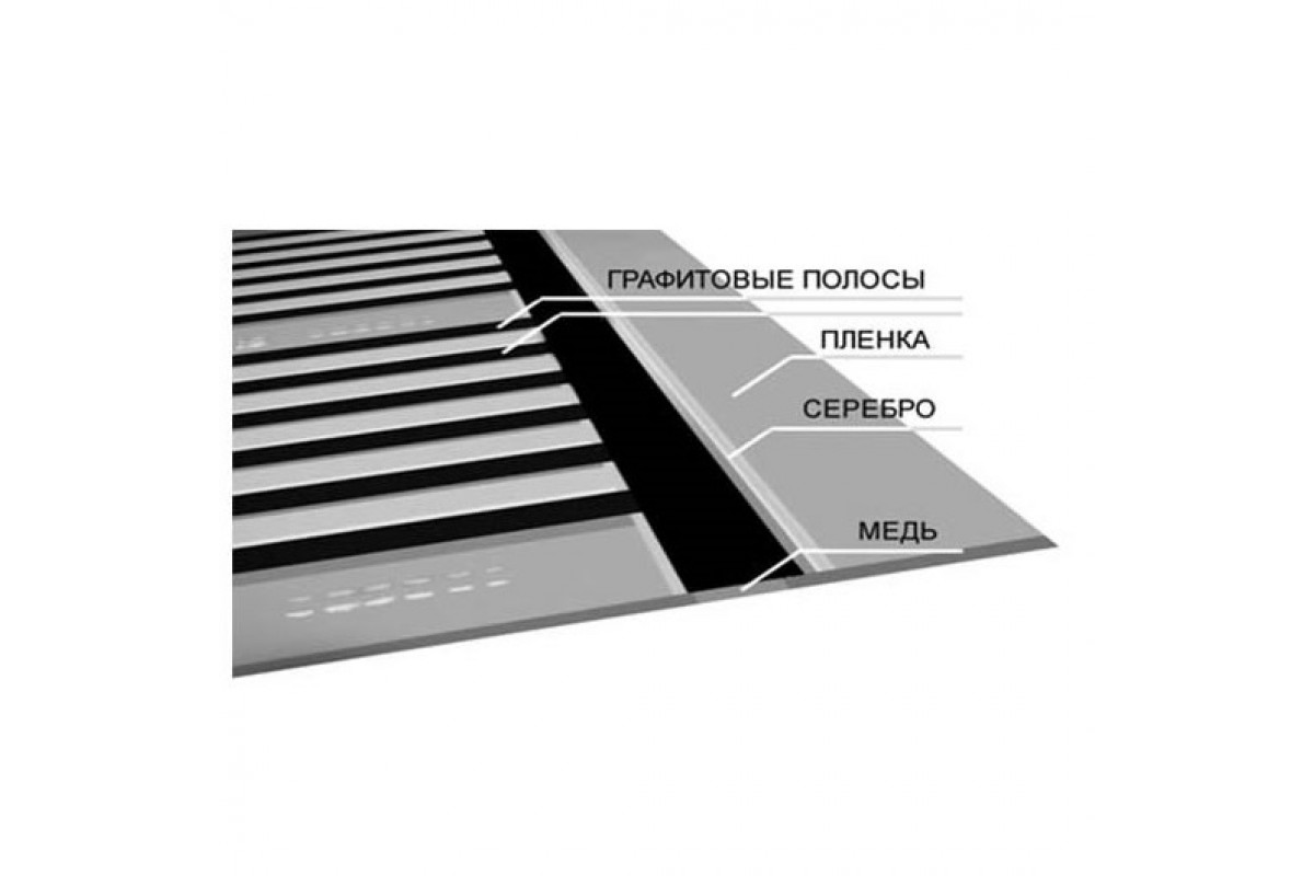Инфракрасный пленочный теплый пол состоит из полос углеродного материала шириной около 1,5см, которые соединены между собой при помощи медных шин с серебряным покрытием, которые и проводят электрический ток. Нагревательный элемент заламинирован с двух сторон плотным полимером, который не задерживает инфракрасное излучение и обеспечивает отличную защиту от попадания влаги, пробоев и возгорания.