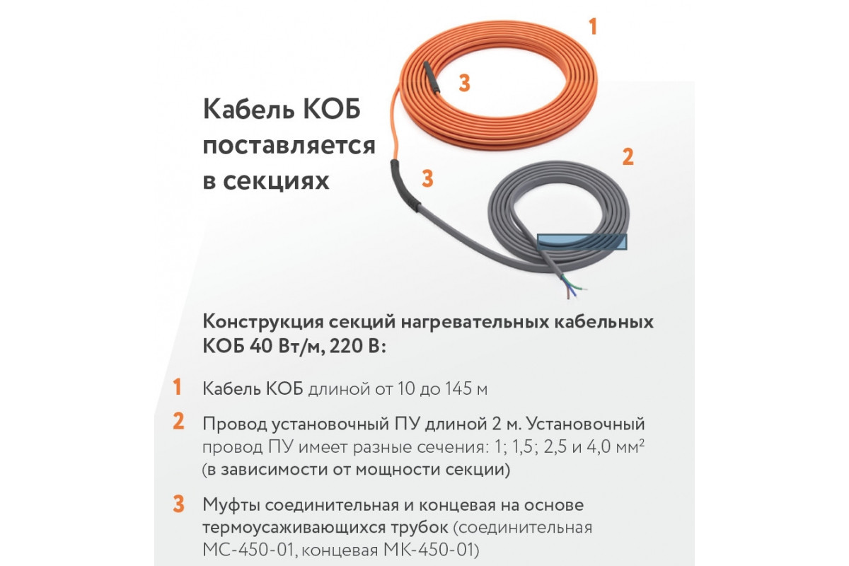 • двухжильный резистивный нагревательный кабель 40КОБ-2 подключается только с одного конца к обычному однофазному источнику питания 210-240В, а его второй конец с установленной концевой муфтой остается свободным и закрепляется в любой зоне обогрева;