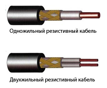 Резистивный кабель с одной жилой имеет одну нагревательную токопроводящую жилу, которая нагревается и передаёт тепло полу. Двужильная конструкция кабеля имеет одну жилу греющую, другая подводит электричество