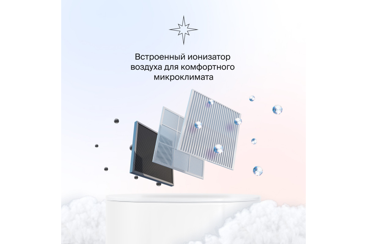 • Биполярный ионизатор: циклически генерирует положительные и отрицательные ионы, создавая ионизированную среду, благотворно влияющую на самочувствие.