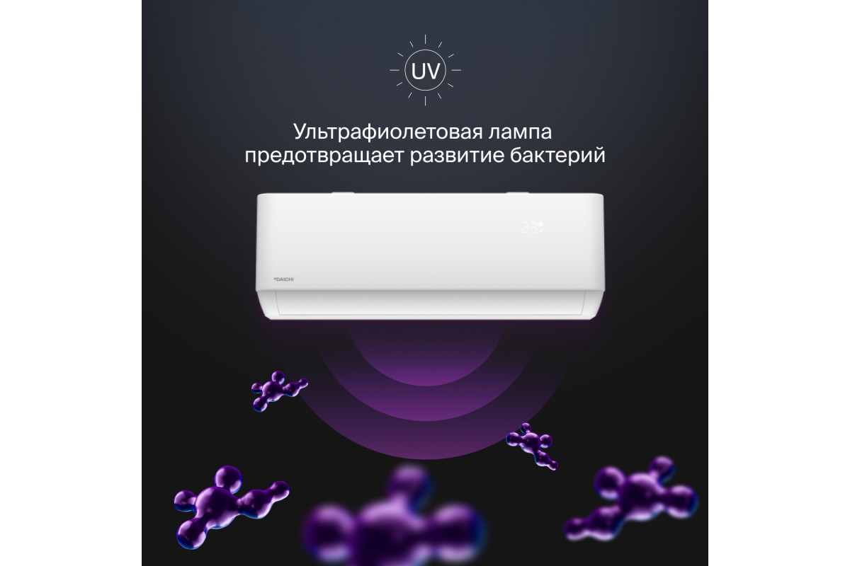 • Ультрафиолетовая лампа: встроенная УФ-лампа предотвращает развитие бактерий на узлах внутреннего блока и обеззараживает воздух, создавая здоровую атмосферу в помещении.