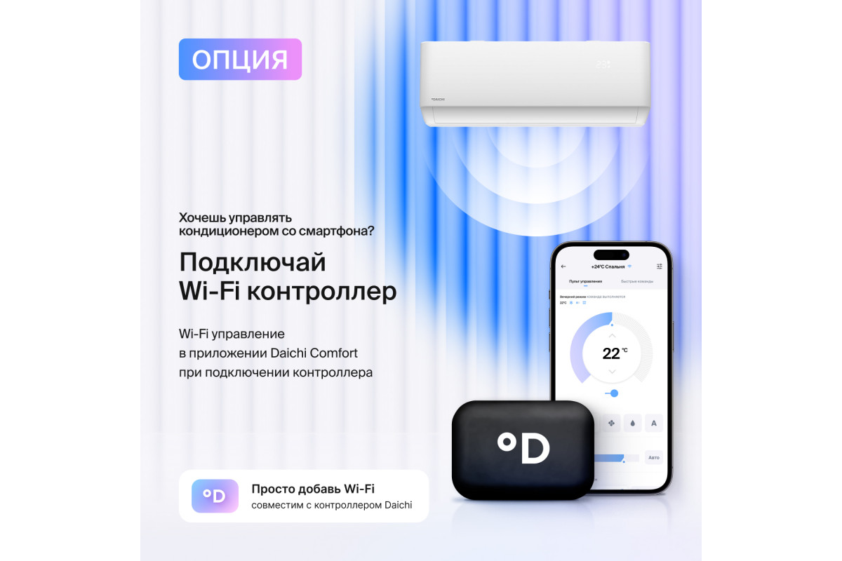 • Wi-Fi управление: возможность удаленного онлайн-управления через приложение «Облако Даичи» (контроллер приобретается отдельно), позволяющее контролировать работу кондиционера из любой точки мира.