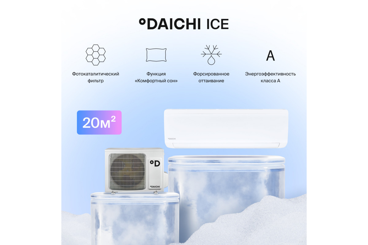 Настенная сплит-система Daichi Ice ICE20AVQ1-1/ICE20FV1-1 идеально подходит для помещений площадью до 20 м² . Это оптимальный выбор для спальни, детской комнаты, кабинета или небольшой студии.