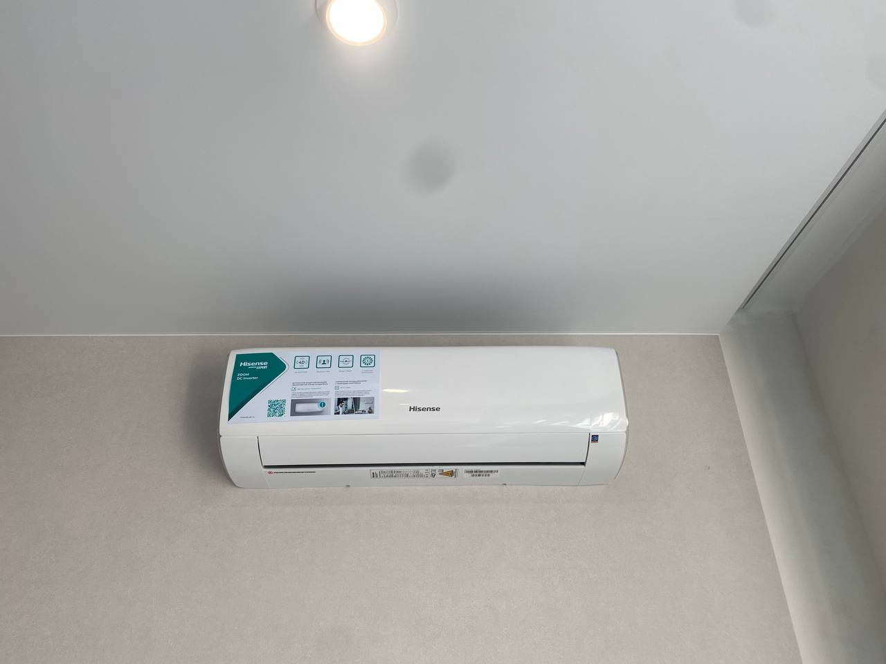 Монтаж внутреннего блока. Внутренний блок кондиционера Hisense был аккуратно установлен на заранее подготовленное место. При этом мы учли расположение мебели и дизайн интерьера, чтобы оборудование гармонично вписалось в пространство квартиры.
