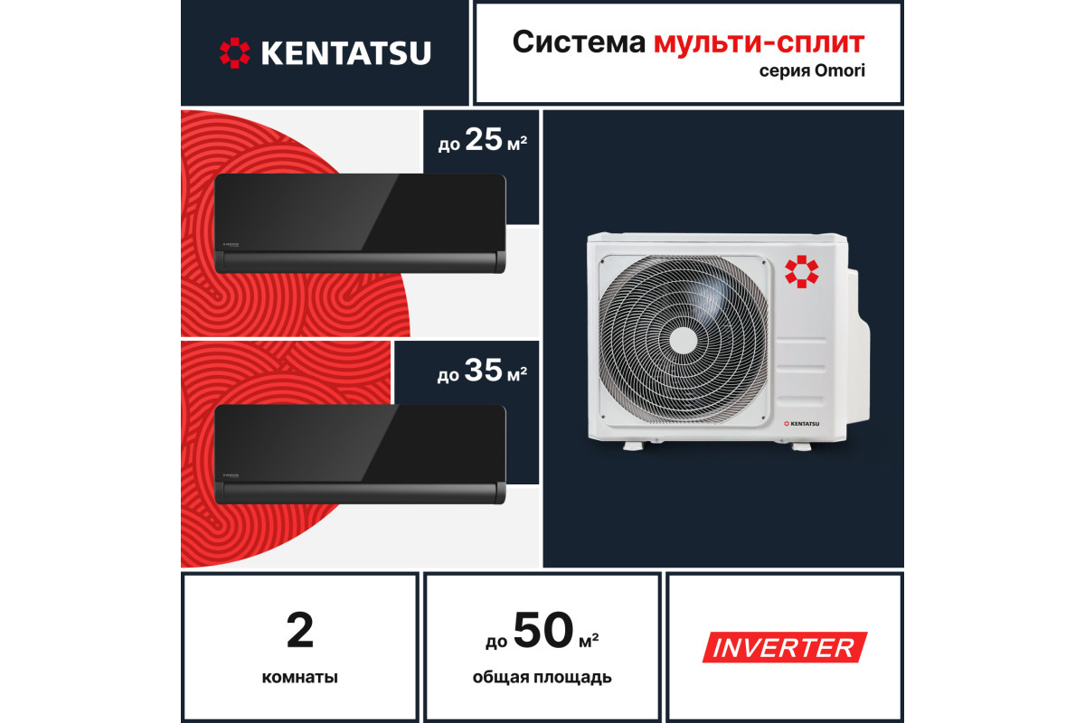 Мульти-сплит система Kentatsu Omori Inverter предназначена для эффективного кондиционирования двух помещений площадью 25 м² и 35 м² соответственно. Общая площадь обслуживания составляет до 50 м².