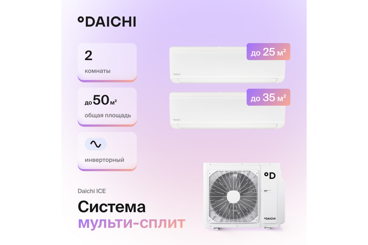 Мультисплит-система Daichi ICE Inverter предназначена для эффективного кондиционирования двух помещений площадью 25 м² и 35 м² соответственно.