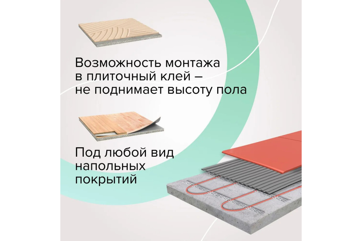 Секция предназначена для укладки в стяжку толщиной 2–5 см или в плиточный клей, что обеспечивает гибкость при установке. Гибкий кабель позволяет легко адаптироваться к сложной геометрии помещения.​