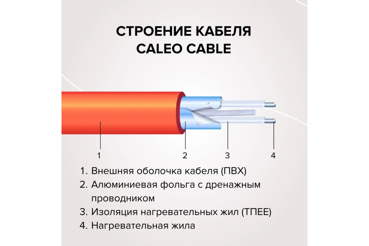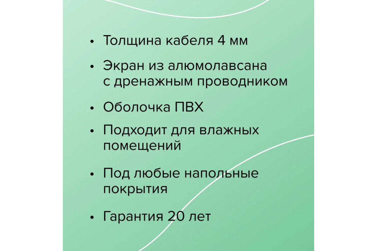 Двухжильный резистивный кабель с двойной изоляцией (ТПЕЕ и ПВХ) и защитным экраном из алюминиевой фольги с дренажным проводником гарантирует долгий срок службы и безопасность эксплуатации. Класс защиты IP67 позволяет использовать секцию во влажных помещениях.​