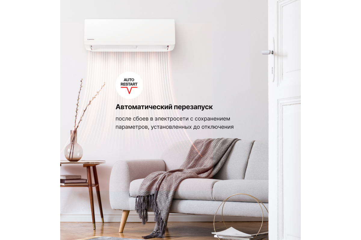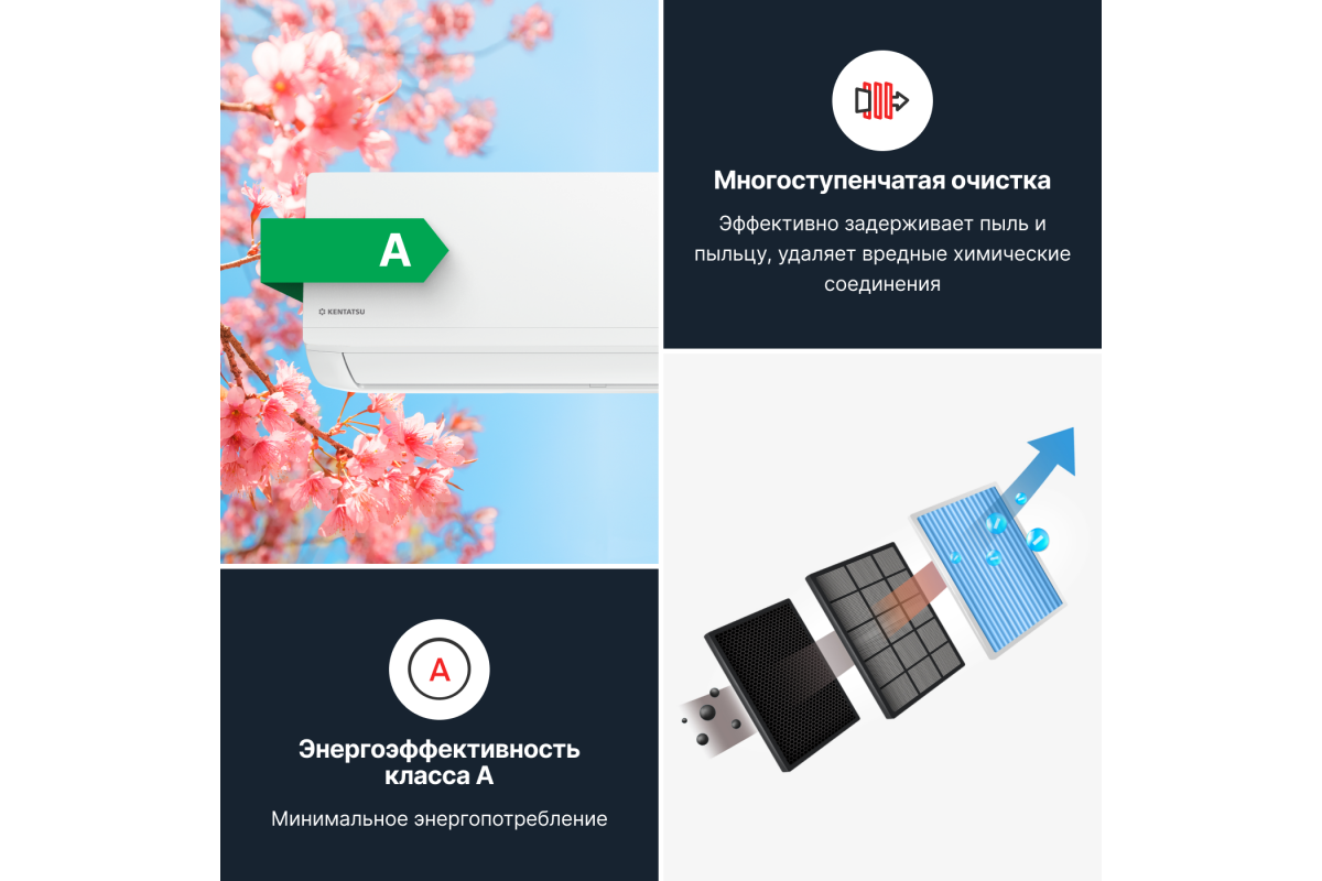 Выбирая Kentatsu Ichi on/off, вы получаете надежное и энергоэффективное устройство с классом энергоэффективности «A» . Это означает минимальное потребление электроэнергии и снижение затрат на эксплуатацию. Кроме того, сплит-система оснащена многоступенчатой системой очистки воздуха, включая фильтр высокой степени очистки и фильтр холодного катализа, что обеспечивает чистый и свежий воздух в вашем доме .​
