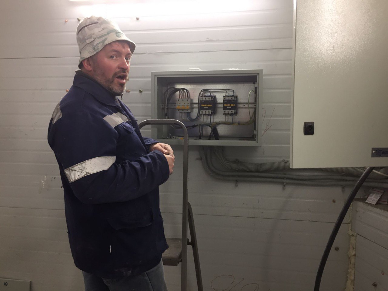 Так как потолки достаточно высоки порядка 8-9 м. был выбран вариант потолочных обогревателей ик 2.8 кВт с температурой нагрева до 300 градусов. В этих обогревателях излучение идет с алюминиевой пластины разогреваемой трубчатым тэном. Наши электрики начали монтаж шкафа управления и прокладку питание. Как видно на фото подключение выполнено с соблюдением всех норм пожарной безопасности.