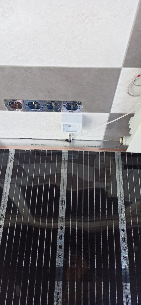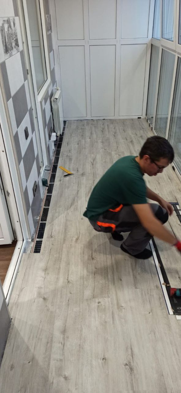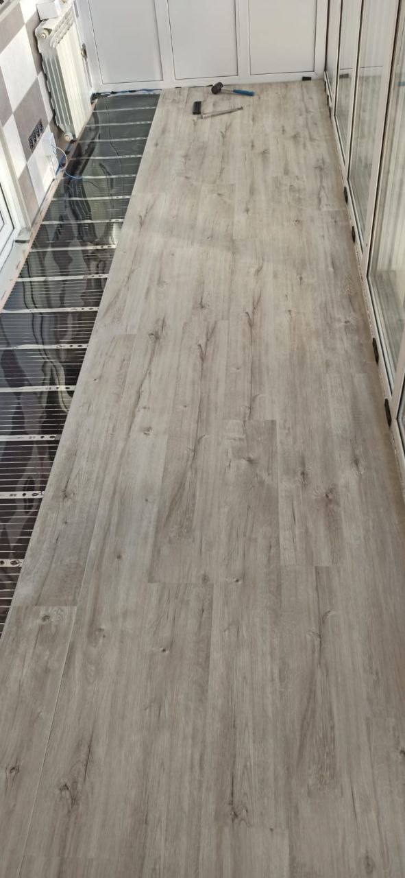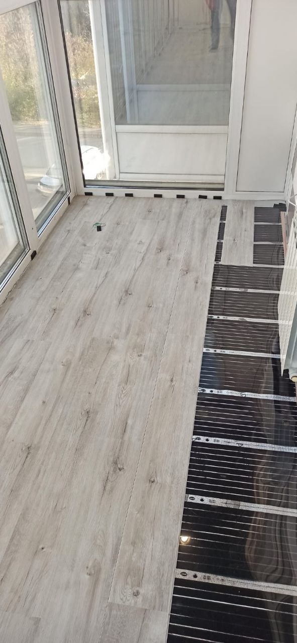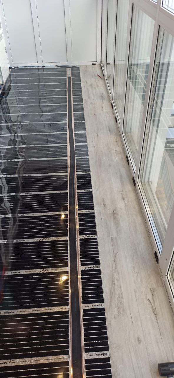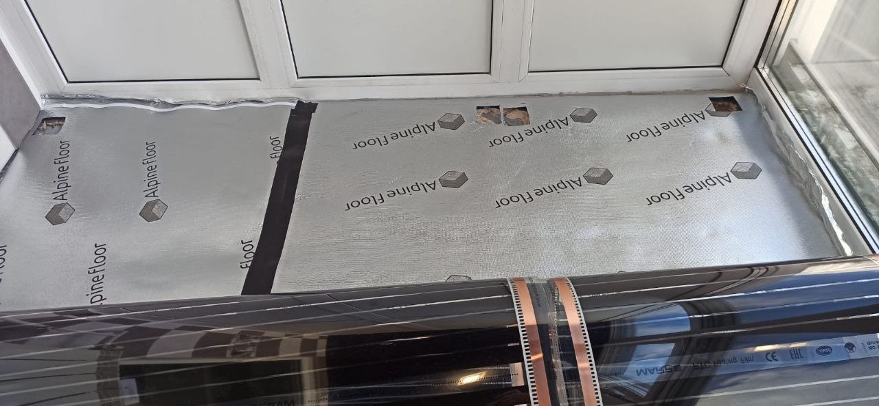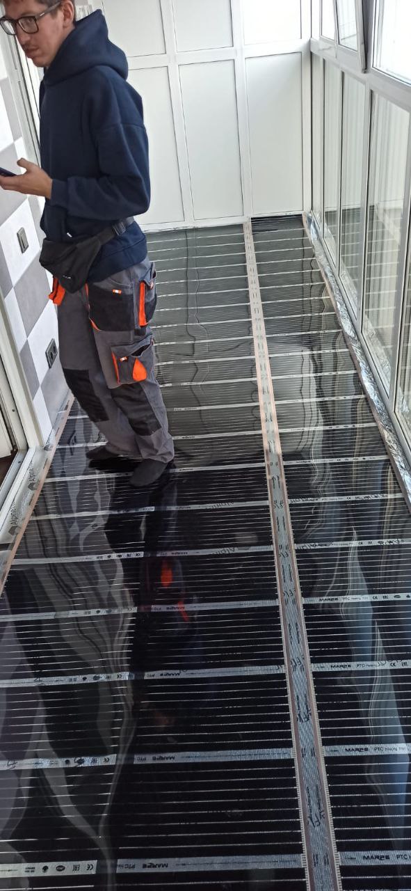 Укладка нагревательной пленки Marpe samreg. Эта пленка отличается высоким качеством и долговечностью, что делает ее оптимальным решением для установки теплого пола в жилых помещениях. Пленка была равномерно распределена по всей поверхности балкона, что обеспечило эффективное прогревание пола.