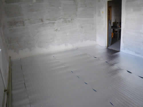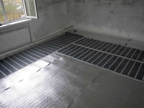 1) На площади 60 кв.м был уложен инфракрасный пленочный теплый пол Q-Term 220Вт/кв.м с шириной полосы 100 см. Для подложки использован специальный теплоотражающий материал, который необходим для предотвращения ухода тепла в бетонное основание коттеджа и повышения энергоэффективности греющей пленки.
