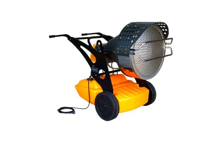 1. Одни модели внешне напоминают тепловую пушку. Конструктивно инфракрасный обогреватель состоит из излучателя цилиндрической формы, изготовленного из теплостойкого металла. В нем монтируется инфракрасный излучатель, который генерирует тепло за счет сгорания дизельного топлива. Внизу расположен топливный бак. Только в отличие от обычной тепловой пушки, вентилятора выдувающего тёплый воздух, у них нет. Передача тепла происходит посредством инфракрасного излучения, которое, в свою очередь, передает тепло воздуху и помещение обогревается.