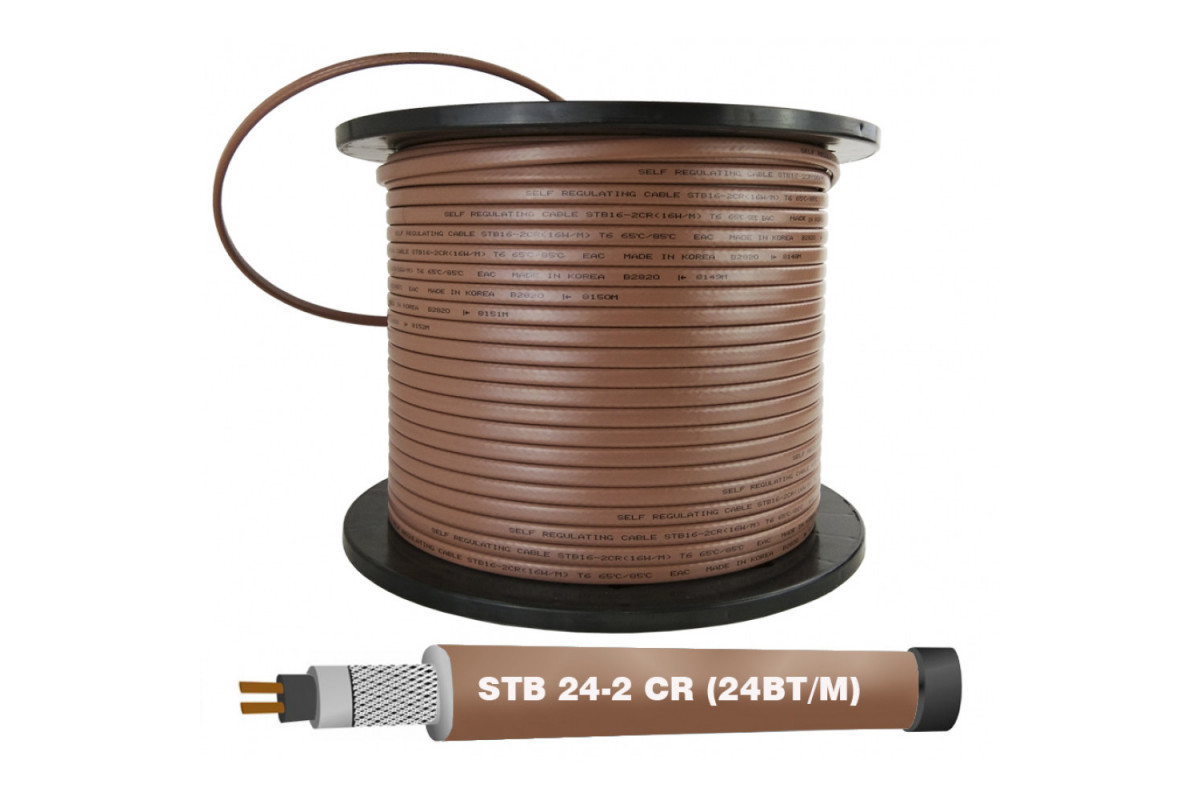 Саморегулирующийся нагревательный кабель STB24-2CR , где 24Вт - линейная мощность на 1 м.пог. кабеля ( в наличии варианты с большей мощностью : STB16-2CR и STB30-2CR) а 2CR - говорит о том, что кабель двухжильный с медной оплёткой, выполняющей роль заземления и дополнительную защиту от механических повреждений) STB24-2CR-это современный, надежный и универсальный источник тепловой энергии для защиты, труб, ливневых и канализационных систем от промерзания в холодное время года.