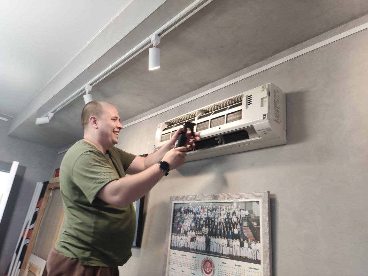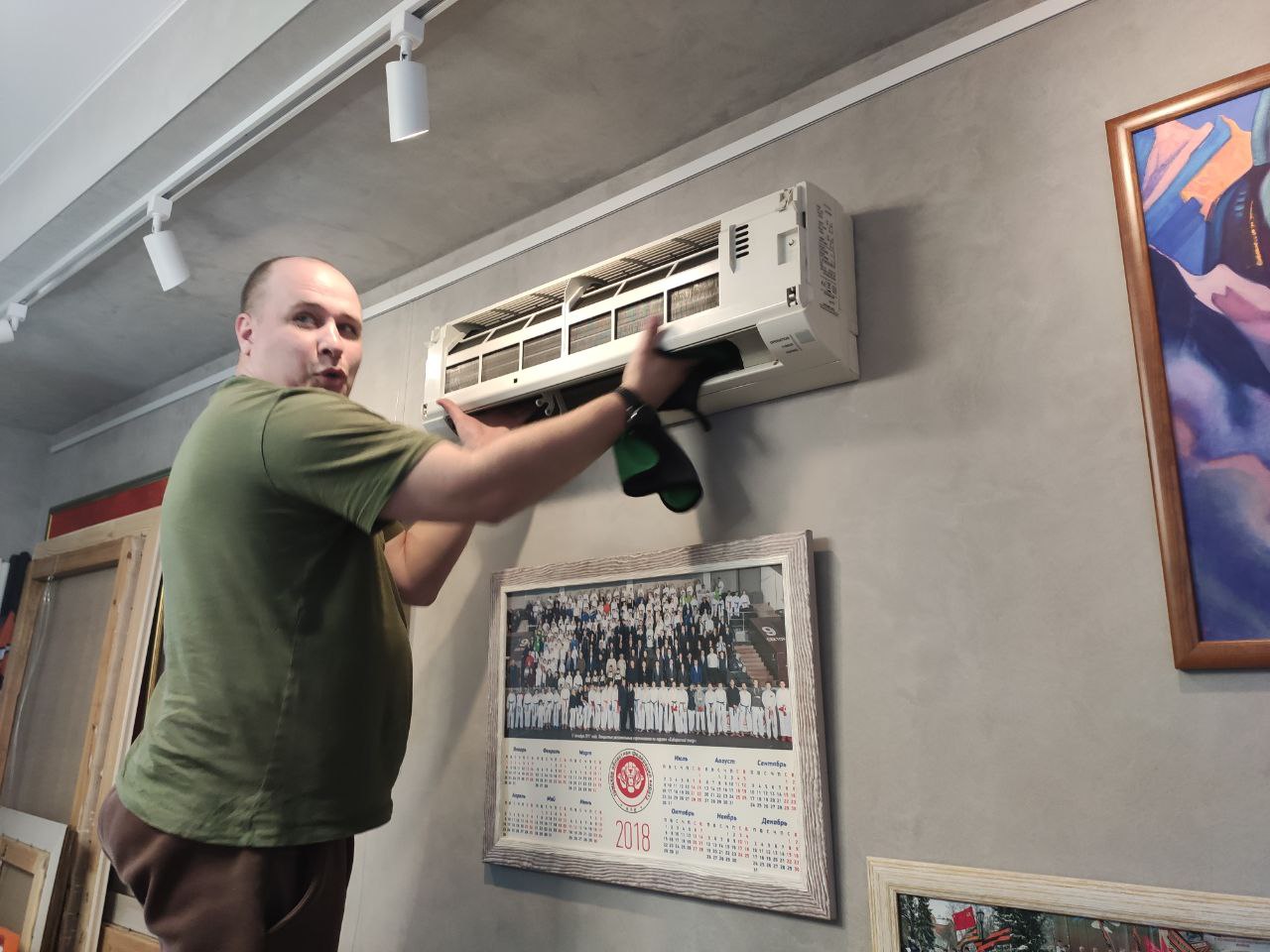 Первый этап включает чистку и проверку внутреннего блока кондиционера. Наш мастер по техническому обслуживанию Сергей использует следующие шаги: