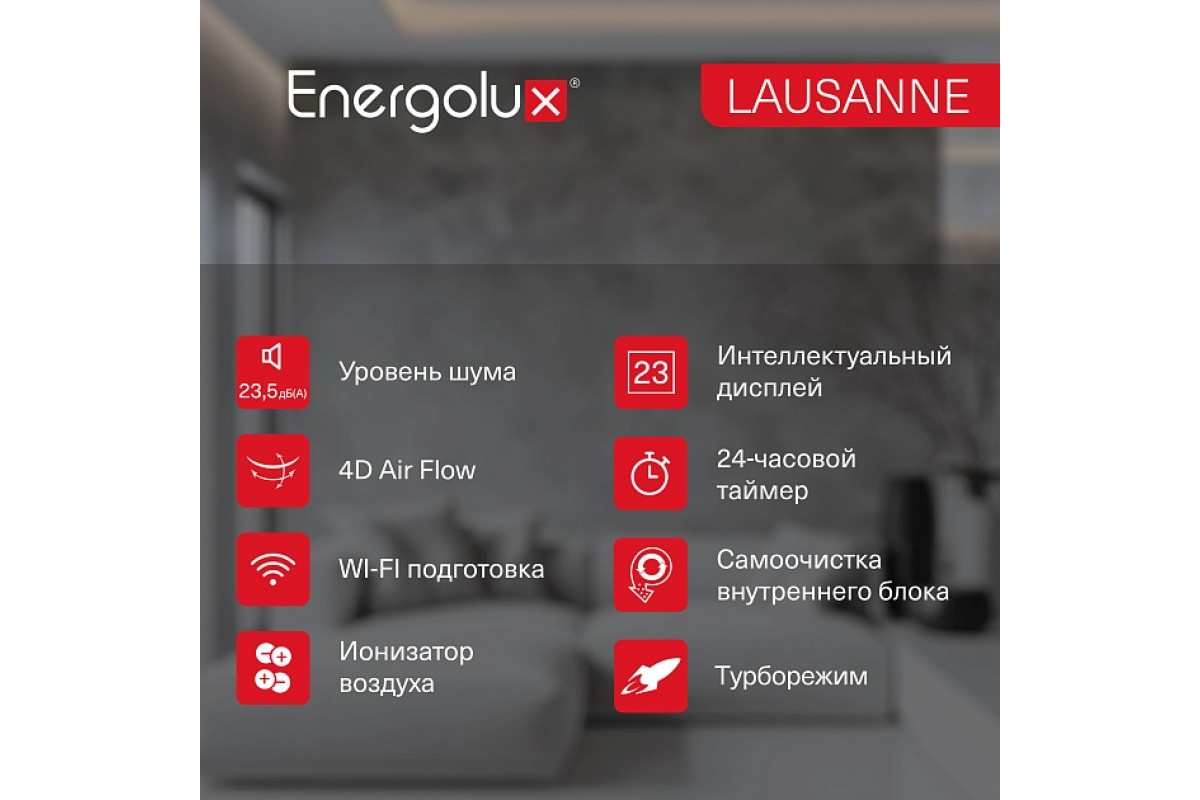 Сплит-система On/Off Energolux LAUSANNE SAS07AR1-A / SAU07AR1-A — это надежное и современное решение для создания комфортного микроклимата в вашем доме или офисе. Благодаря широкому набору функций, высокой энергоэффективности и стильному дизайну, эта модель станет незаменимым помощником в любое время года.​