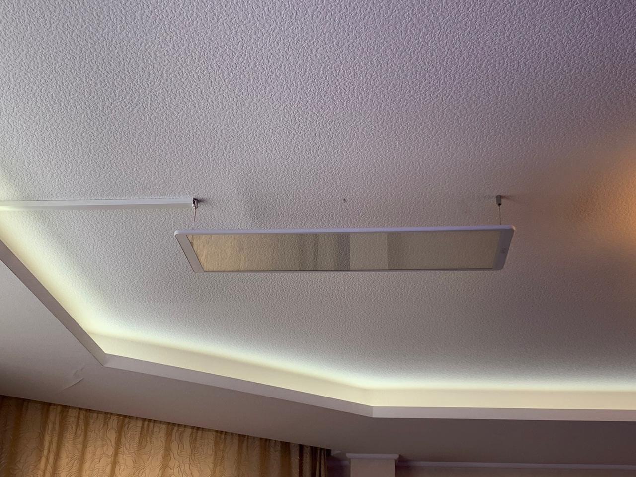Такие обогреватели могут устанавливаться в помещения повышенной влажности, имеют класс защиты от влаги IP 54, в этом проекте один обогреватель мы установили в ванной комнате. КПД Пион Crystal достигает 97%, к тому же эти обогреватели полностью бесшумные.
