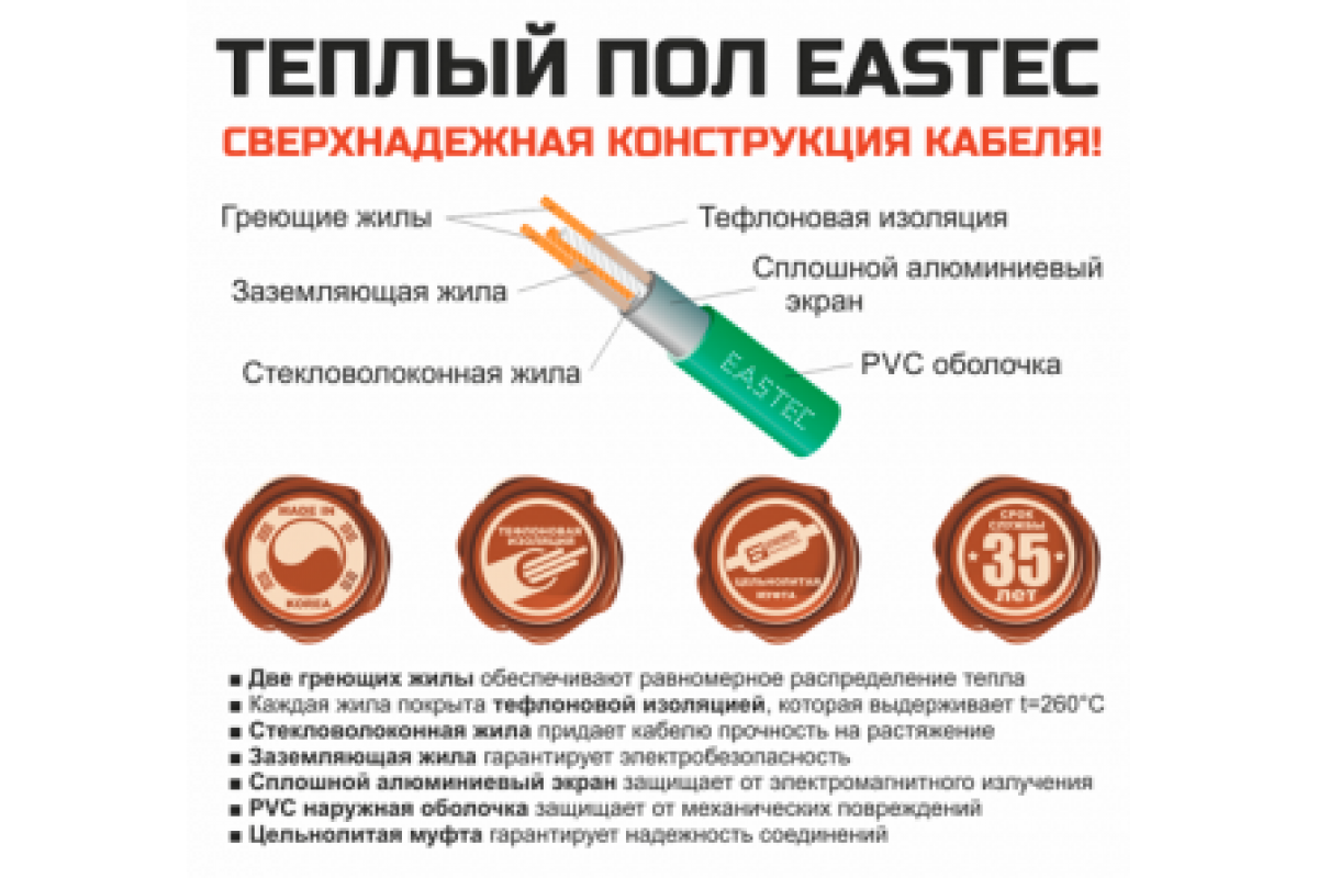 Теплый пол кабельный EASTEC ECC-1600 (20-80) - 80 м.п.( 10,5-12,0 м.кв.) комплект — надёжное решение для комфортного обогрева небольших помещений