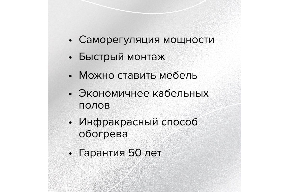 Благодаря инфракрасному излучению с длиной волны 5–20 мкм, теплый пол обеспечивает равномерный прогрев поверхности, создавая комфортные условия в помещении. Антиискровая сетка повышает безопасность эксплуатации, предотвращая возможные короткие замыкания.​