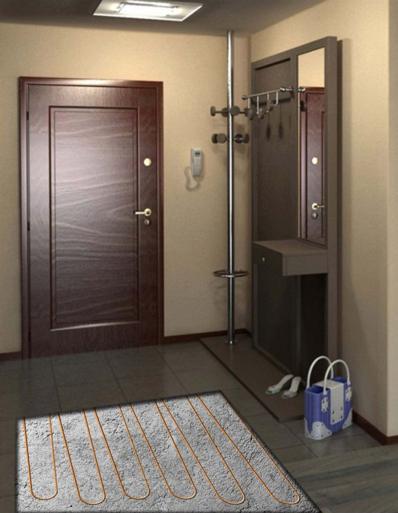 Кроме того, в прихожей мы ставим обувь и вешаем одежду. Теплый пол поможет ускорить процесс высыхания мокрых вещей без использования специальных приспособлений.