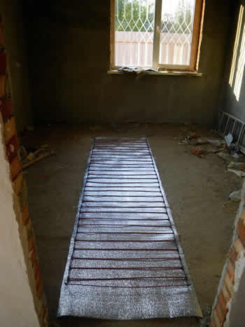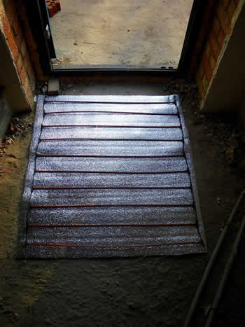 Теплорасчет и выбор теплового оборудования был сделан быстро, согласование технических особенностей укладки системы теплых полов с заказчиком прошло конструктивно, с пояснениями всех нюансов монтажа. Для обустройства теплых полов был выбран карбоновый мат RHE/GT (116Вт/мп). На чистое бетонное основание укладывался теплоизолирующий материал для увеличения теплоотдачи, на заранее определенном месте раскладывался греющий мат, в полу проштробили паз для прокладки термодатчика пола, помещенного в гофрированный шланг. С помощью специальных комплектов полосы мата соединялись в единую систему. Сверху греющие маты заливались плиточным клеем и укладывалась сверху керамическая плитка. Были установлены в прихожей и кухне отдельные терморегуляторы, подобранные по необходимой мощности. Вот примерный ход произведенных работ. Помещения были сравнительно небольшие – общей площадью 20 кв.м, потому работы проходили быстро и без осложнений.
