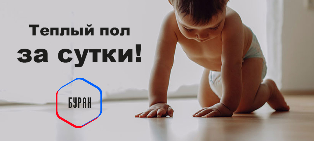 Боитесь отпускать малыша на холодный пол? Специальное предложение для молодых родителей — теплый пол за сутки от компании «Буран»! Демонтируем и смонтируем линолеум и плинтуса, установим теплый пол и терморегулятор в течении одного дня. Закажите теплый пол под линолеум и бригаду монтажников сегодня, и уже через сутки ваш малыш будет смело ползать по теплому безопасному полу!