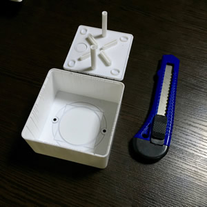 Этим ножом с внутренней стороны коробки вырезаем отверстие нужного размера, такое, чтобы в него плотно вошла колодка терморегулятора. Для облегчения этой операции в коробке есть разметка по которой производим вырез отверстия.