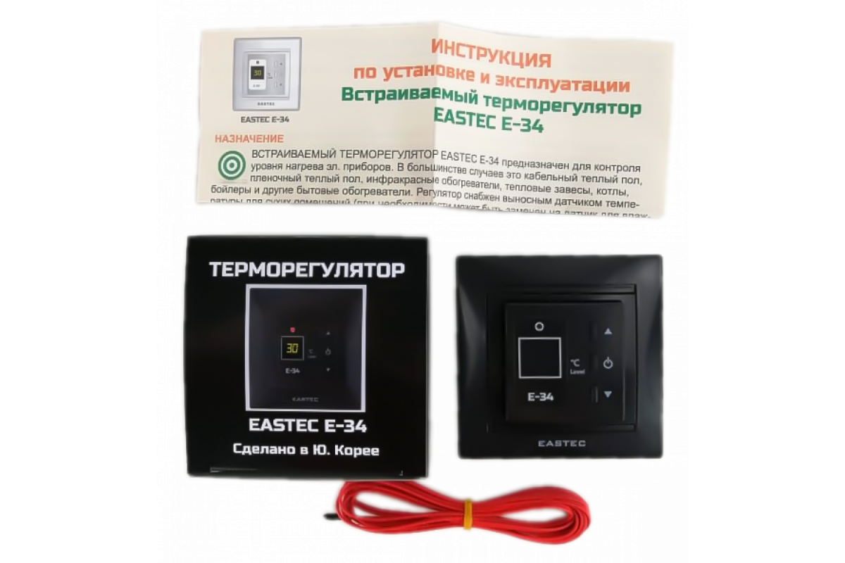 EASTEC E-34 подходит для управления кабельными тёплыми полами, инфракрасными плёночными системами и другими электрическими обогревателями. В комплект входит датчик температуры пола, обеспечивающий точное измерение и поддержание заданной температуры.​