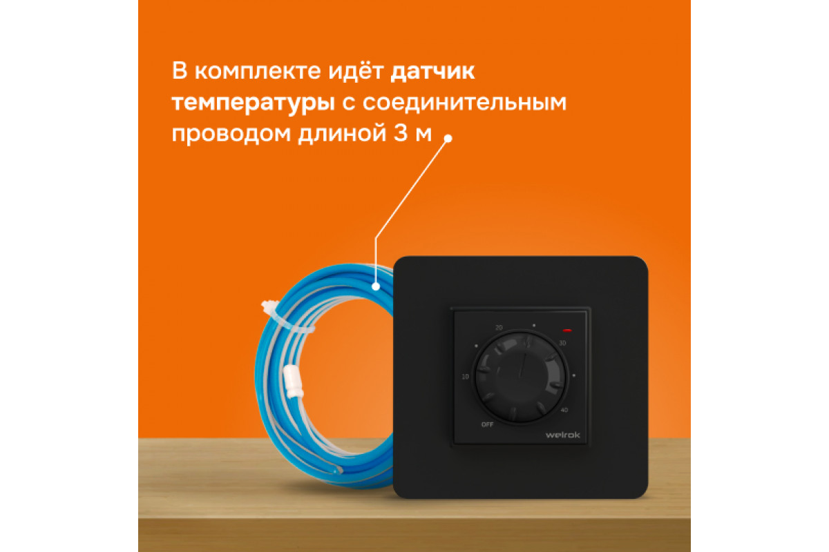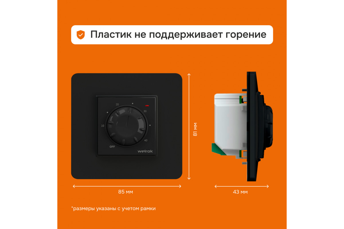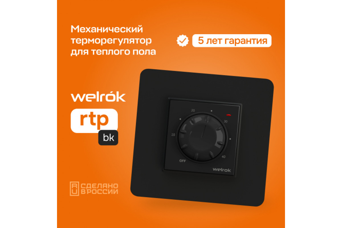Welrok RTP BK оснащён механическим регулятором температуры, что обеспечивает интуитивно понятное управление без необходимости программирования. Пользователю достаточно установить желаемую температуру с помощью поворотной ручки.