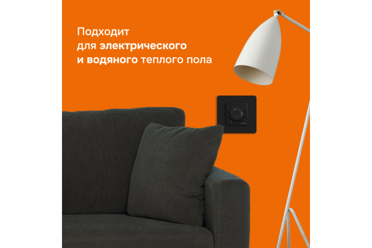 Устройство изготовлено из негорючего пластика и имеет степень защиты IP20, что обеспечивает безопасность при эксплуатации. Выносной датчик температуры пола длиной 3 метра входит в комплект поставки, обеспечивая точное измерение температуры.