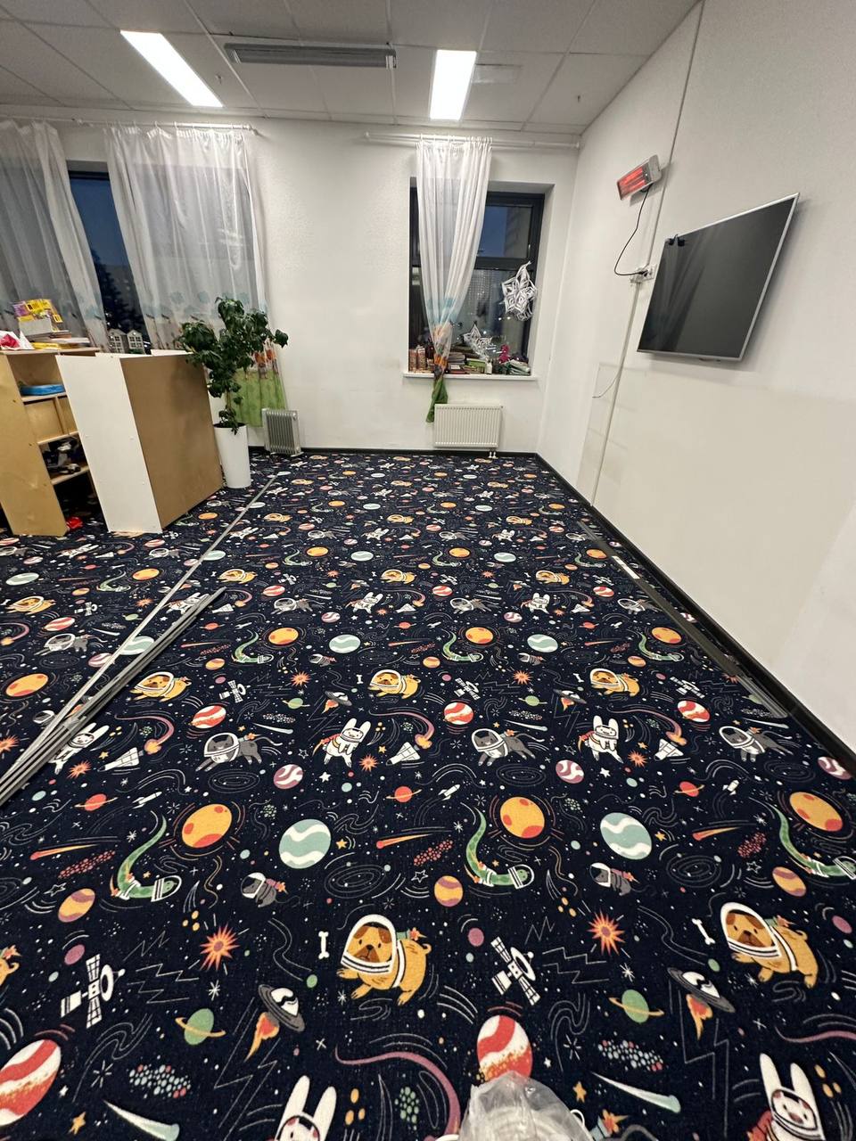 Завершающим этапом стала укладка нового ковролина. Было выбрано яркое и весёлое покрытие, соответствующее атмосфере детской комнаты. Ковролин не только добавляет уюта, но и служит дополнительным слоем теплоизоляции, что особенно важно для помещений, где дети проводят много времени на полу. Правильная укладка ковролина поверх тёплого пола обеспечивает долговечность и эффективность всей системы обогрева.