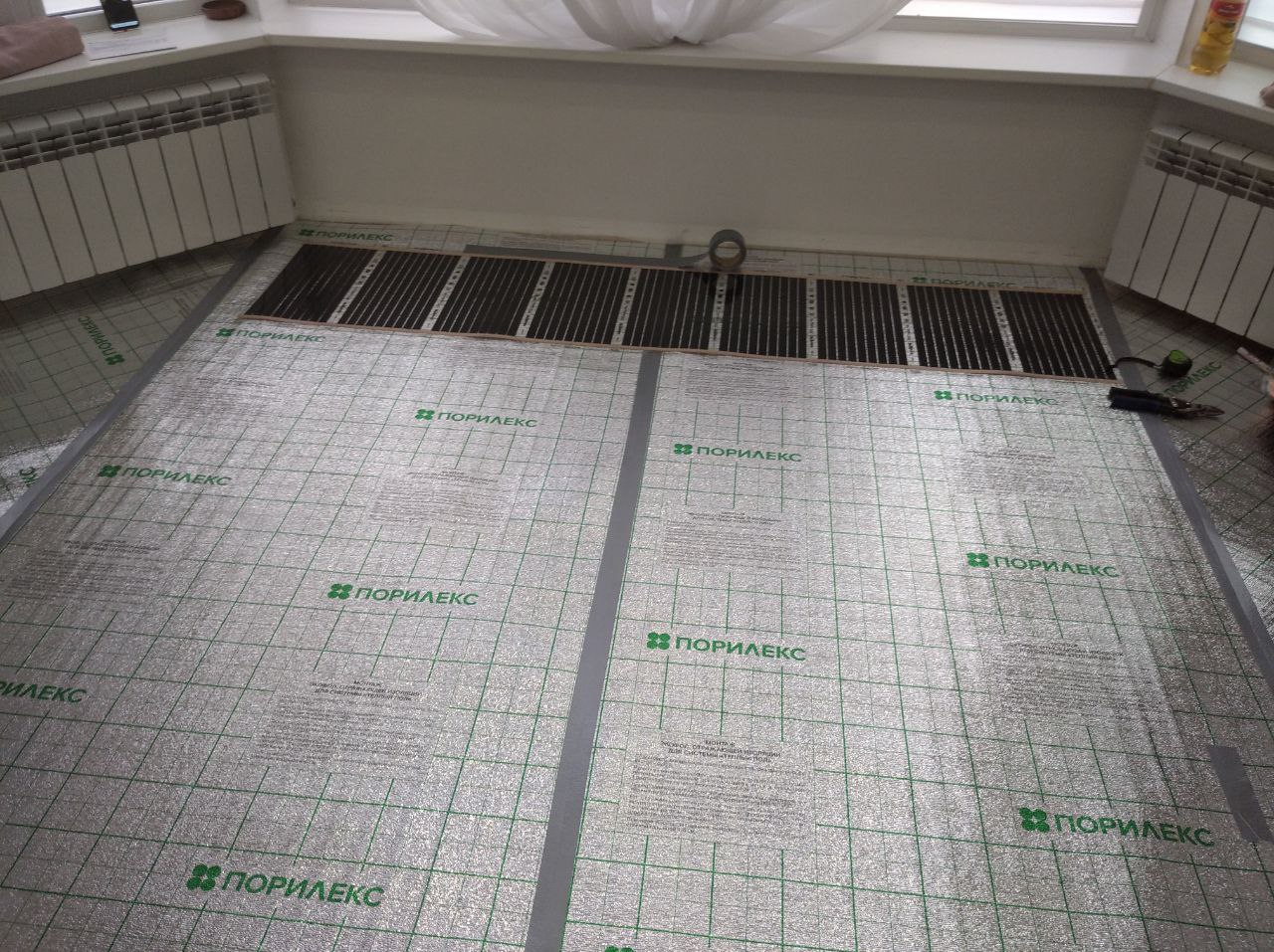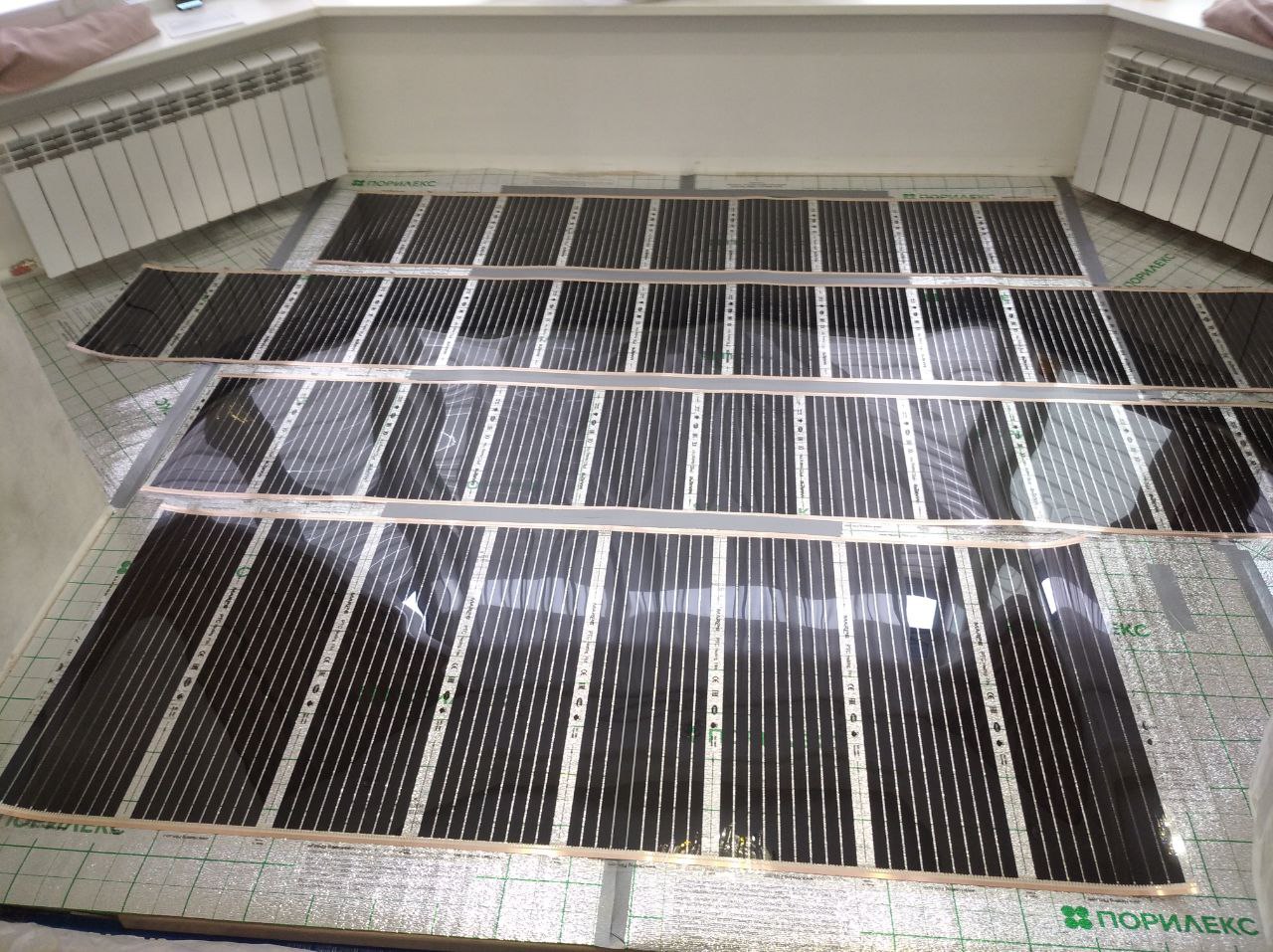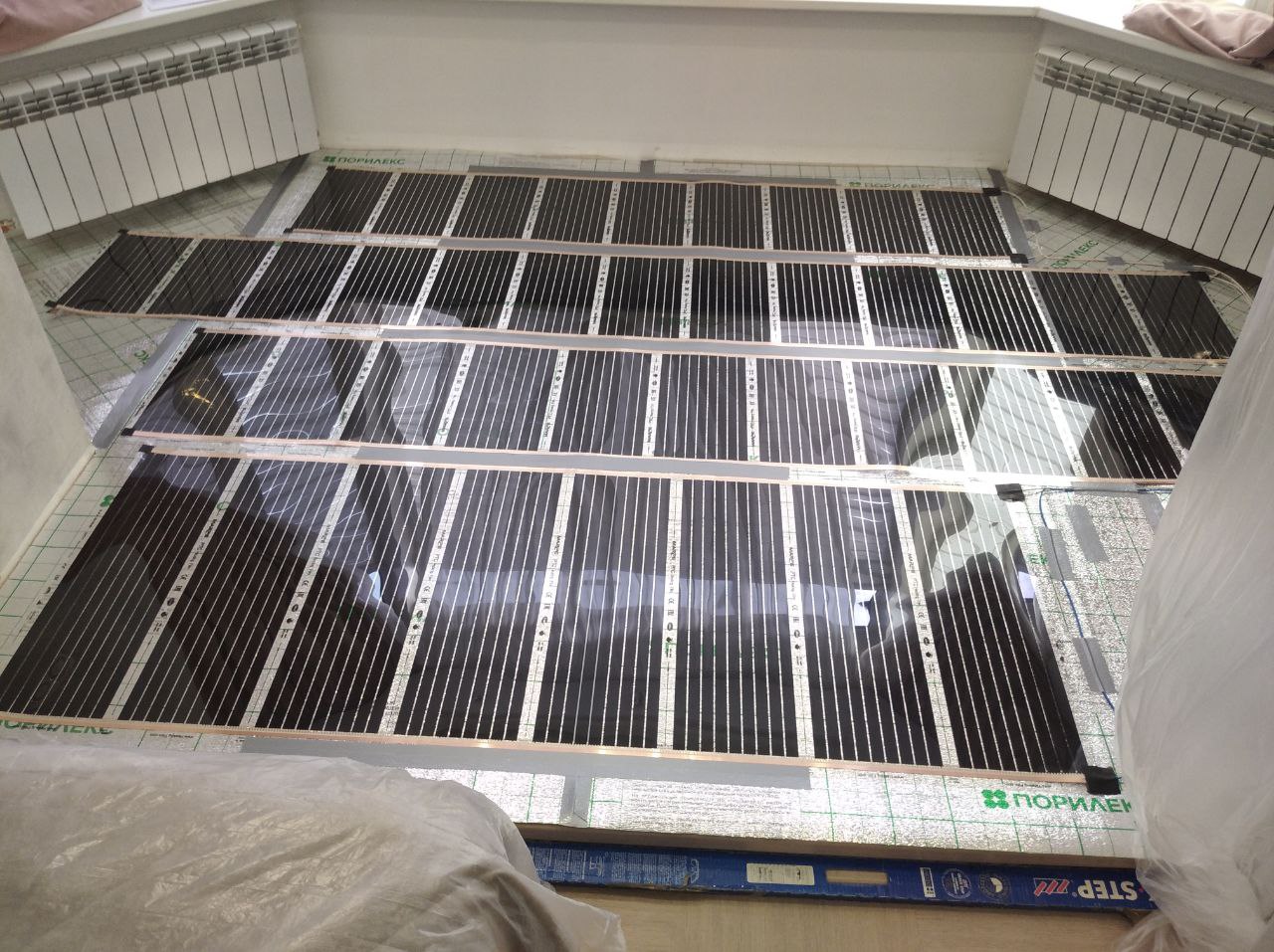 После подготовки пола мы приступили к установке пленки. Особенностью пленки Marpe является ее гибкость, что позволяет укладывать ее даже в труднодоступных местах. Каждый участок пленки был закреплен с учетом пожеланий Юлии — мы обеспечили равномерное распределение тепла по всей площади лоджии.