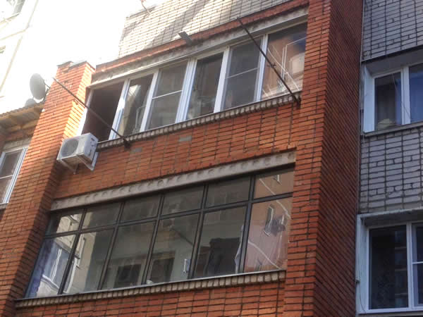 Внутренний блок размещен над окном. Внешний блок вынесен на ограждение балкона, с доступом к нему через правое крайнее окно.