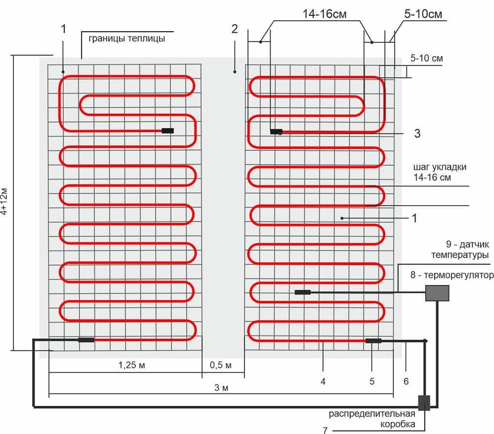 Перед установкой греющего кабеля необходимо определить площадь теплицы и количество кабеля, которое потребуется для обогрева. Затем необходимо провести подготовку грунта: убедиться в его чистоте от камней и других препятствий. Греющий кабель укладывается на глубину 10-15 см, с расстоянием между витками не менее 10 см.