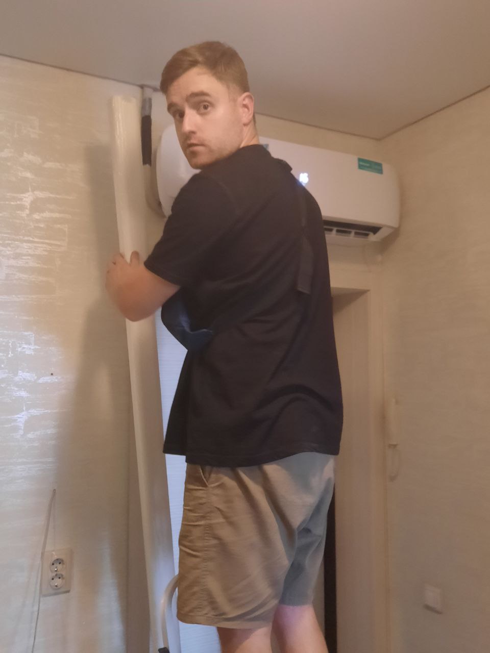 Подобрав оборудование и согласовав дату монтажа выехали на объект, начали работы. Небольшая сложность была в том, что монтаж выполнялся уже при сделанном чистовом ремонте и в квартире были натянуты потолки. Но когда небольшие трудности нас останавливали? Никогда! Аккуратно было снято два полотна натяжного потолка, трасса фреонопровода была проложена по потолку и в результате спряталась за ним же. Кондиционер расположился на том месте, которое выбрал заказчик.