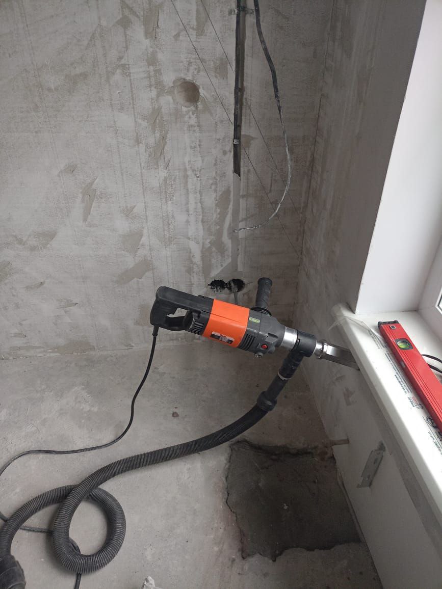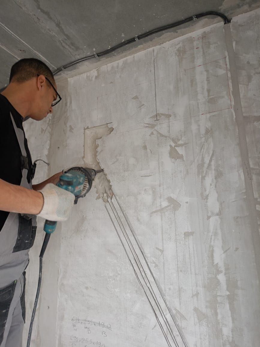 После согласования плана и выбора оптимального маршрута трассы, мы переходим к штроблению стен или потолков. Этот процесс включает создание канала для труб и кабелей кондиционера. Для этой задачи монтажники Антон и Алексей использовали профессиональное оборудование – штроборез Метабо, что позволило выполнить работы быстро и с минимальным количеством пыли.